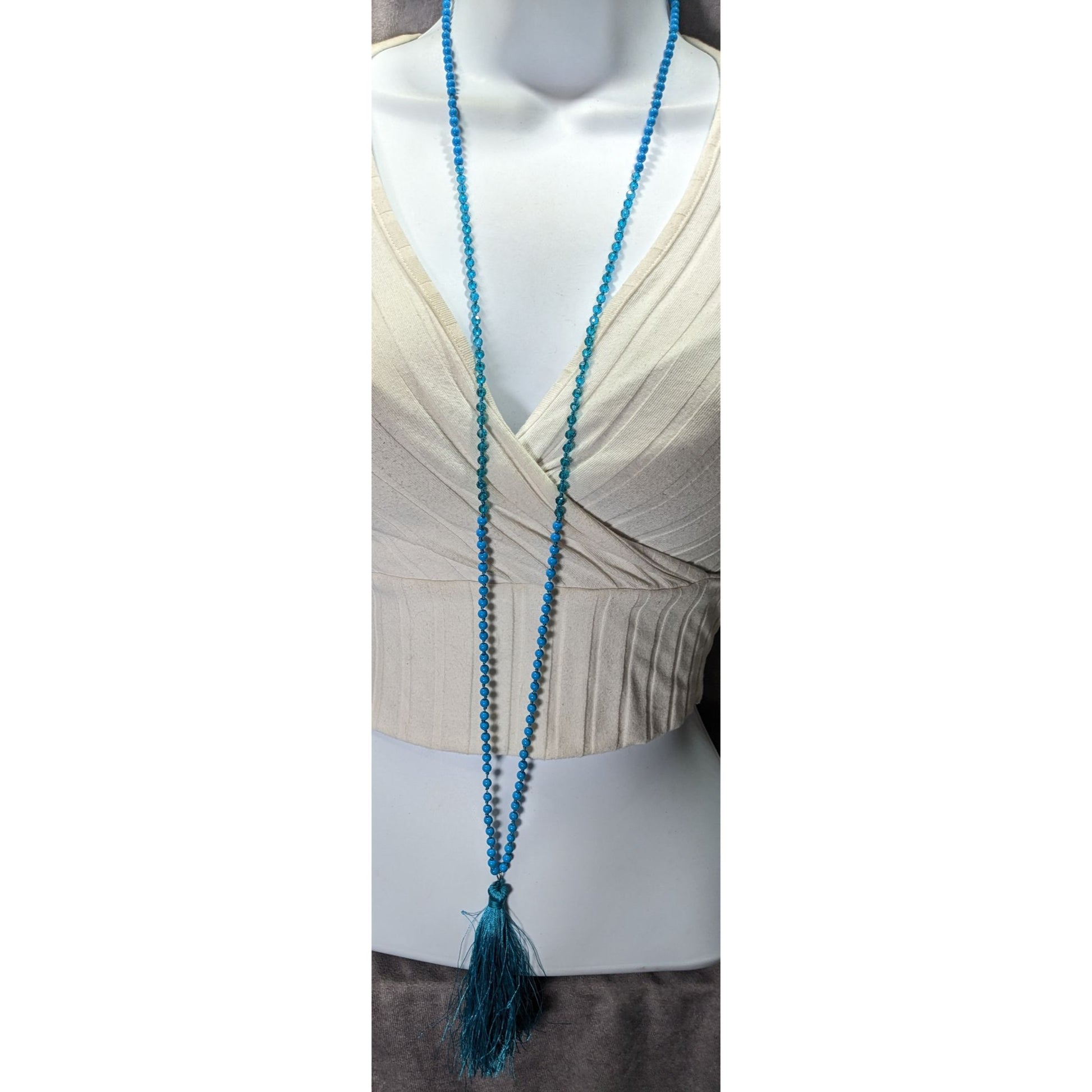 A strand of dazzling blue beads cascades gracefully, ending in a vibrant tassel. This necklace brings a touch of bohemian elegance to your ensemble.