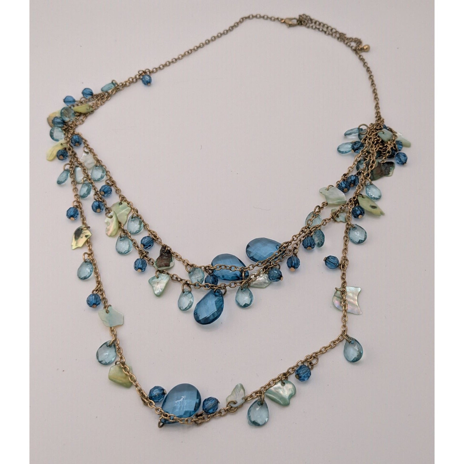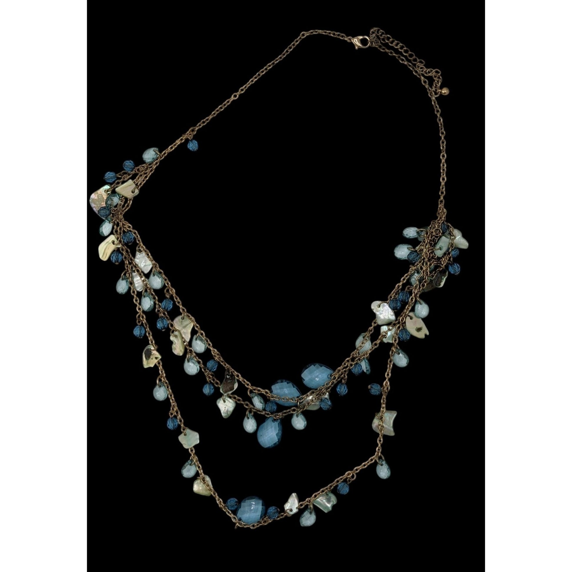 This cascading necklace tells a story of flowing rivers and shimmering moonlight. Its delicate gold-toned chains are adorned with blue shell chips and and beads, creating a striking, layered design. Adjustable with a 3-inch extender, it suits various necklines and occasions, blending boho vibes with elegance effortlessly.