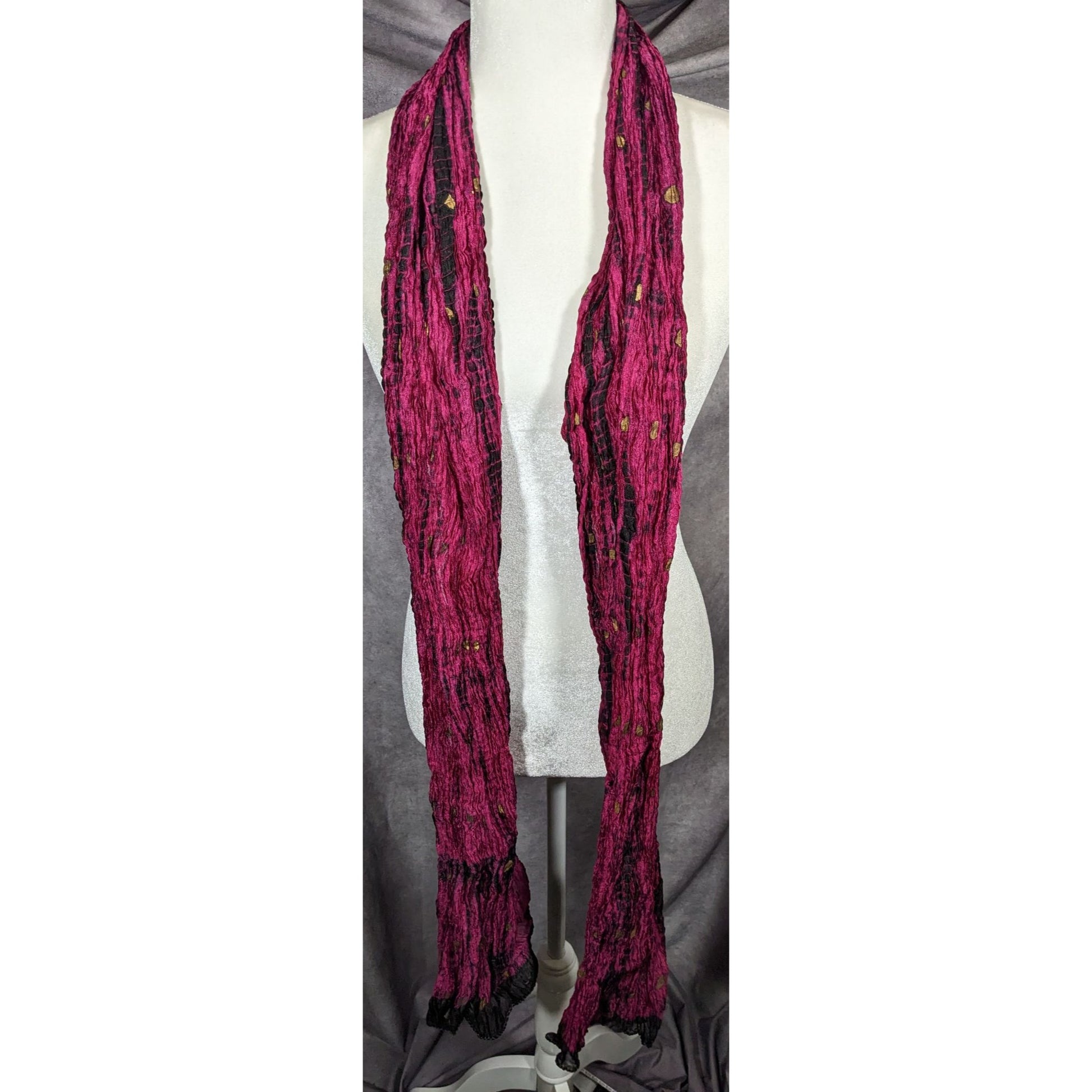 Elevate any outfit with this bohemian-style scarf. The pink and black tie-dye pattern is complemented by luxurious gold accents. Perfect for adding a touch of elegance to casual or formal wear. Lightweight and versatile.