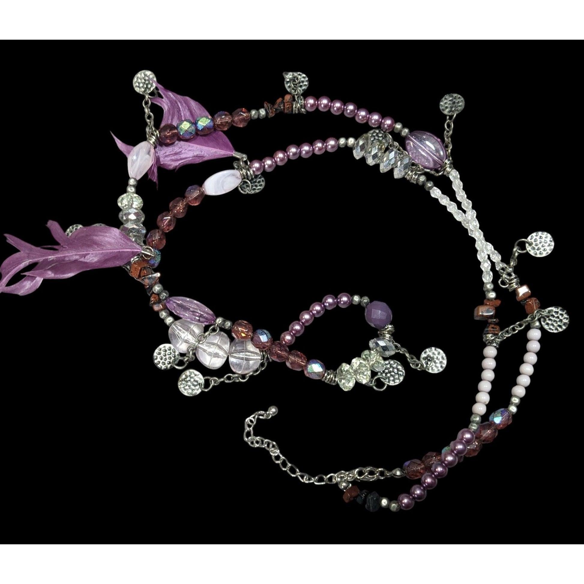 Bohemian Purple And Silver Tone Charm And Feather Beaded Necklace