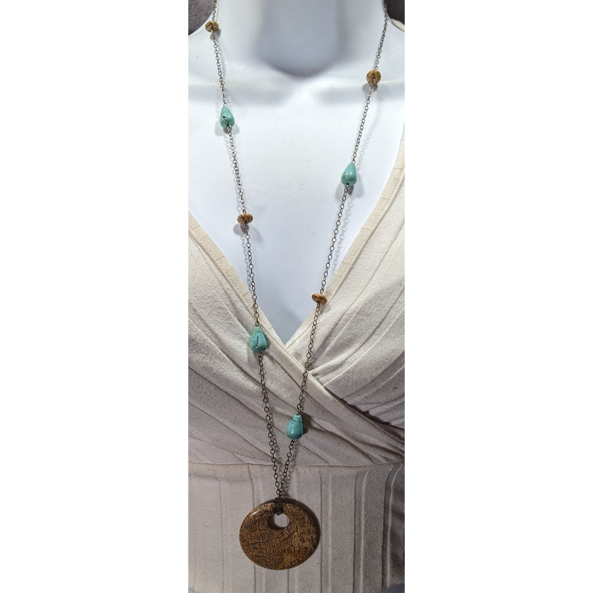 Embrace boho chic with this stunning turquoise and jasper beaded pendant necklace. Perfect for casual or festival wear, it adds a touch of nature-inspired elegance to any outfit.