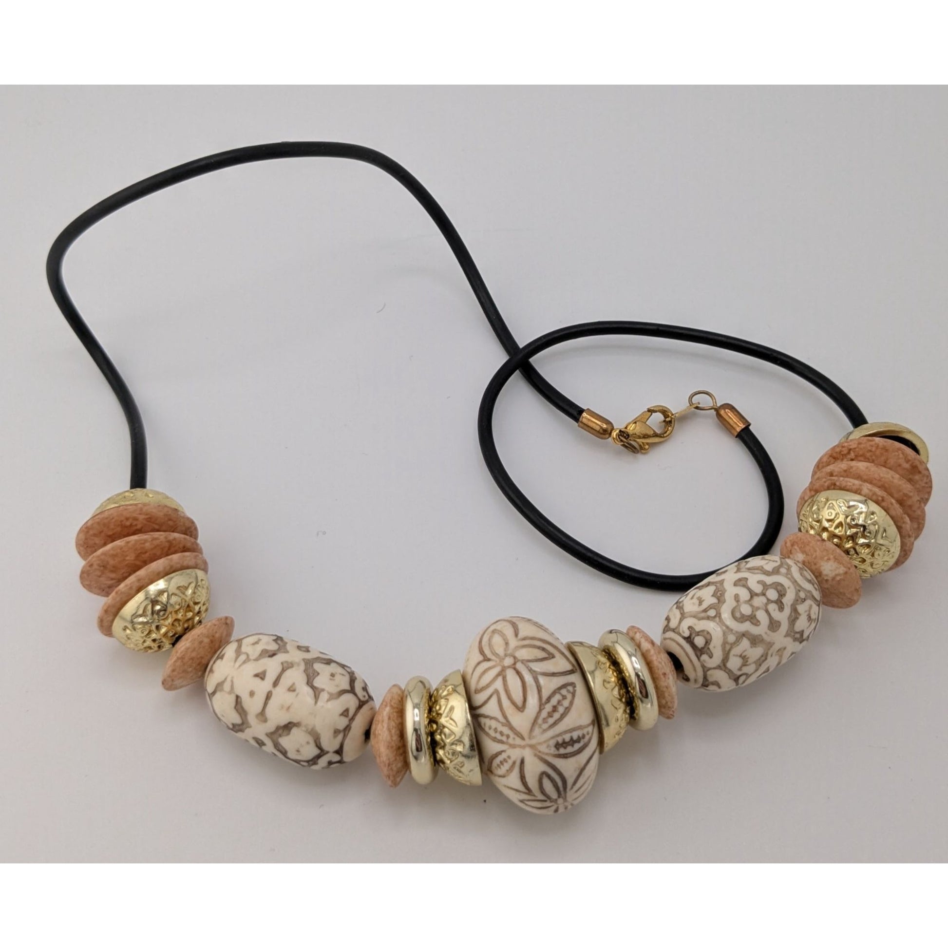Boho Black Gold-Tone And Beige Acrylic Necklace With Accents Floral Etched Beads