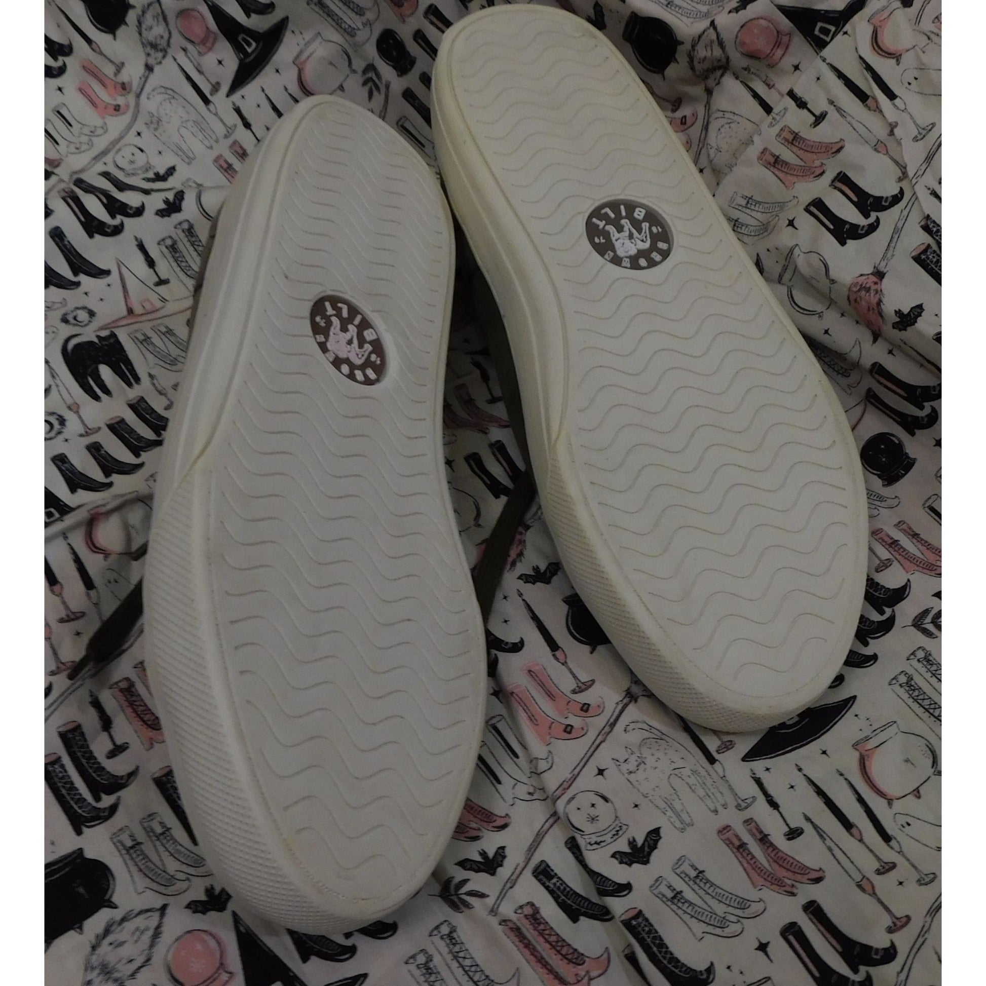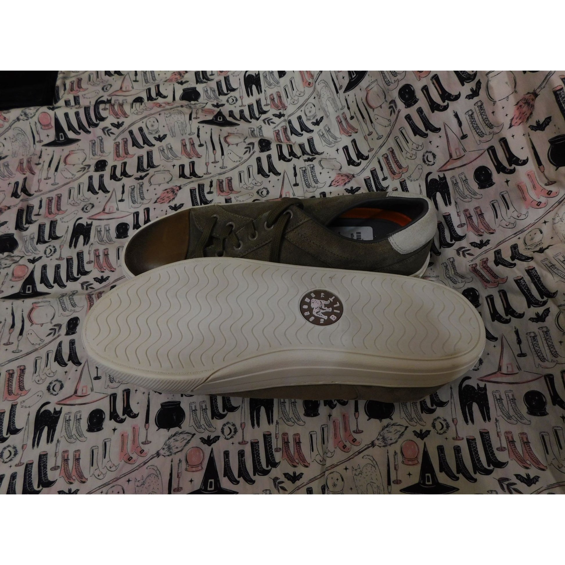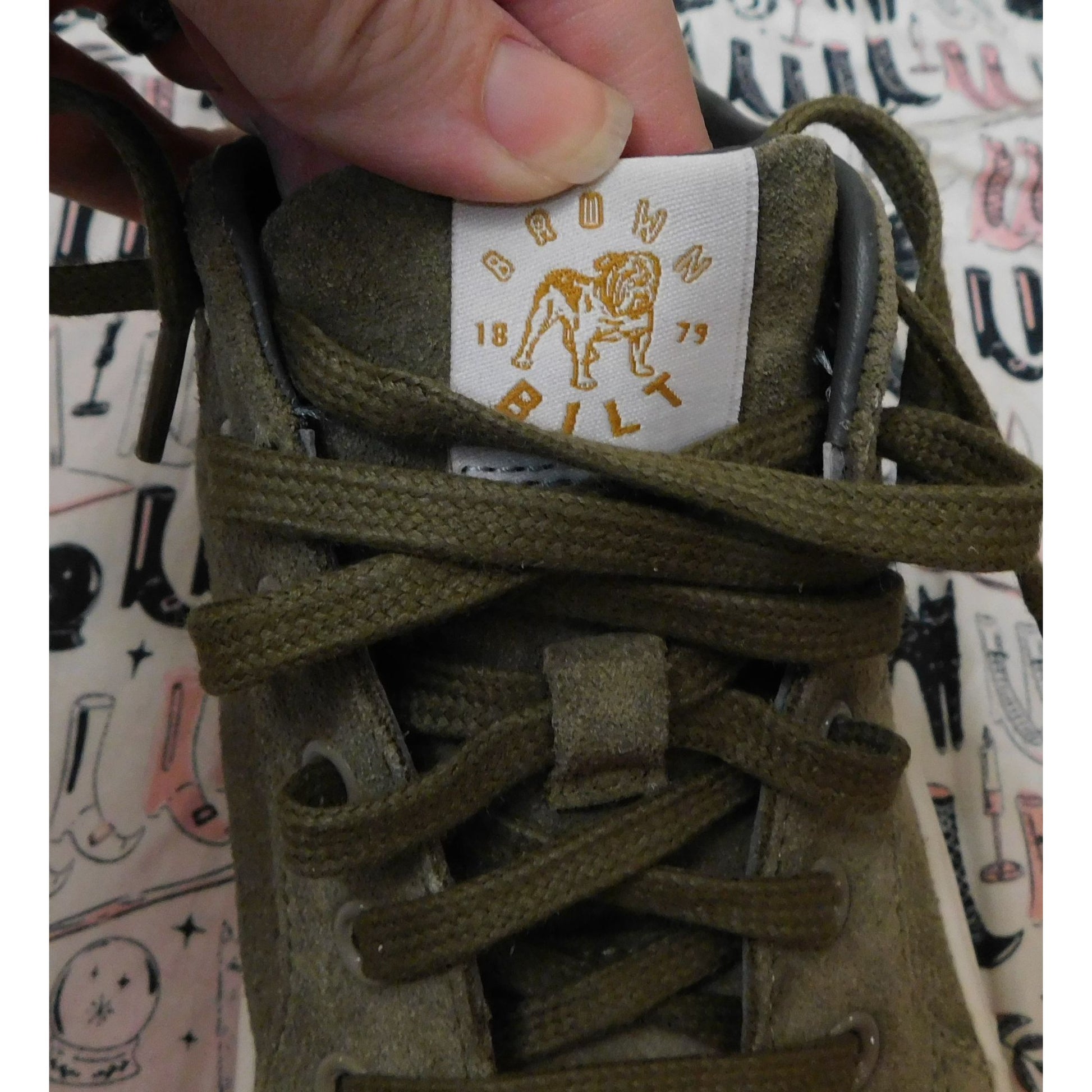 They're brand new, and have never been worn. They are a greyish tan suede, with smooth brown toes. The outsoles are white and have the Brown Bilt logo in the middle. The back of the soles say BILT. The insoles are grey and orange. They have grey laces, and the tongue has the Brown Bilt patch on them. They still have the sticker tags on the heel of the insole as well. Great shoes for everyday wear!