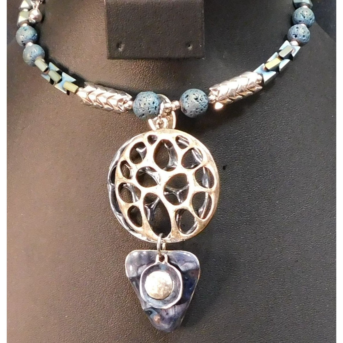 Brutalist Abstract Blue And Silver Tone Volcanic Rock Necklace