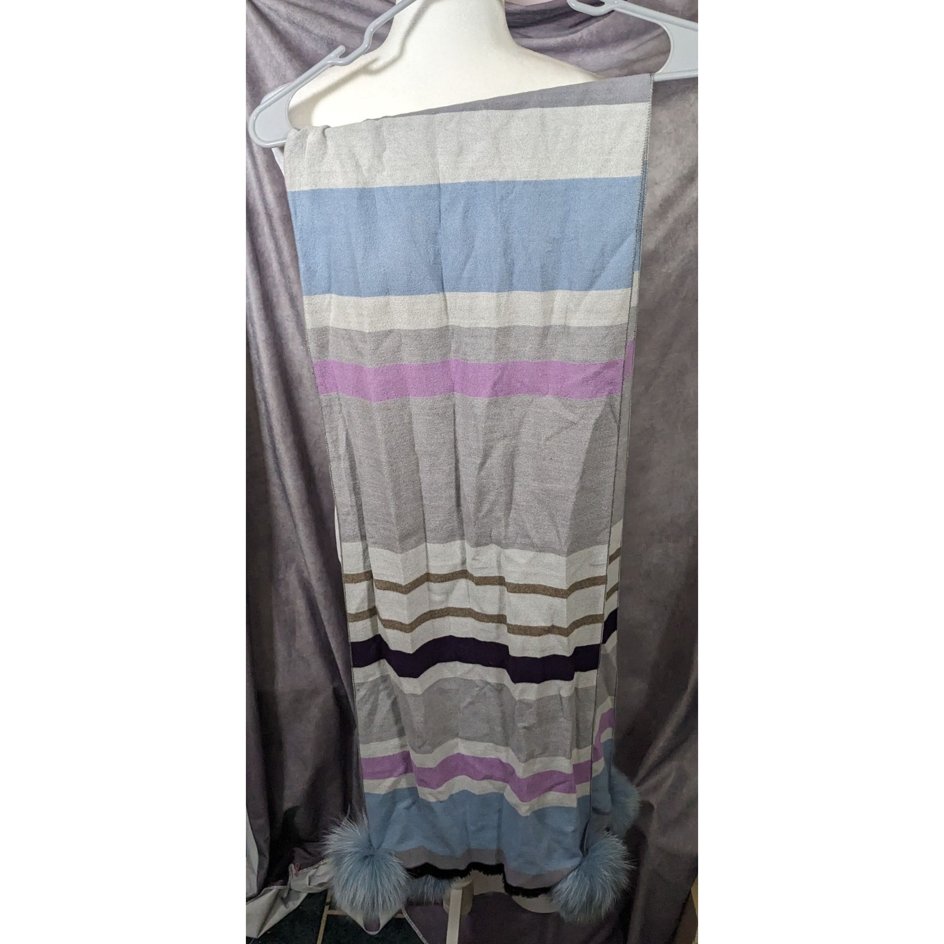 Elevate your style with this chic scarf featuring a blend of grey, purple, and blue stripes adorned with playful pompoms. Perfect for adding a pop of color to any casual outfit.