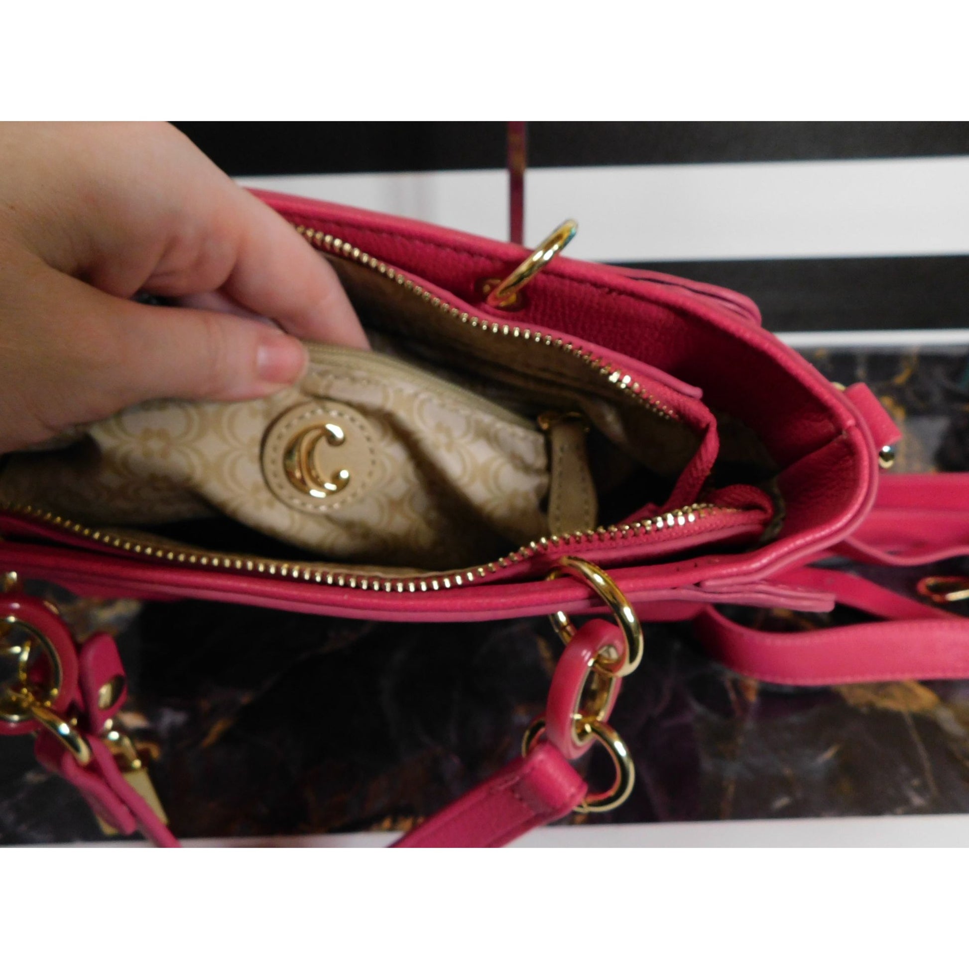 This vibrant pink Charming Charlie handbag combines elegance and practicality. Featuring gold accents, a secure zip closure, and a roomy interior, it's perfect for organizing essentials. The adjustable strap allows for effortless style transitions. The soft texture and rich color make it a standout piece.