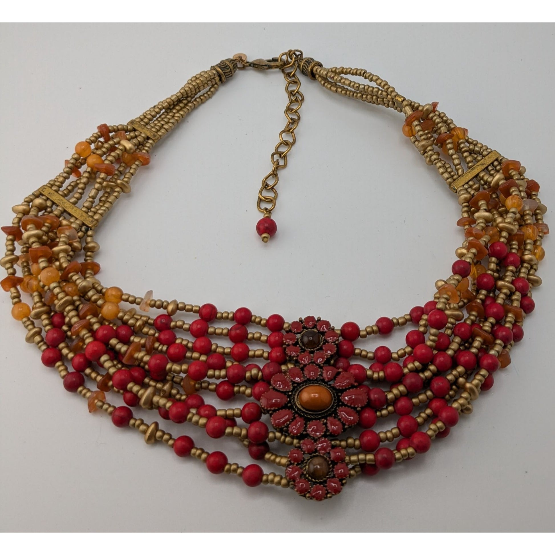 Chicos Vintage Bohemian Multi-Strand Beaded Statement Necklace Red And Gold Tones