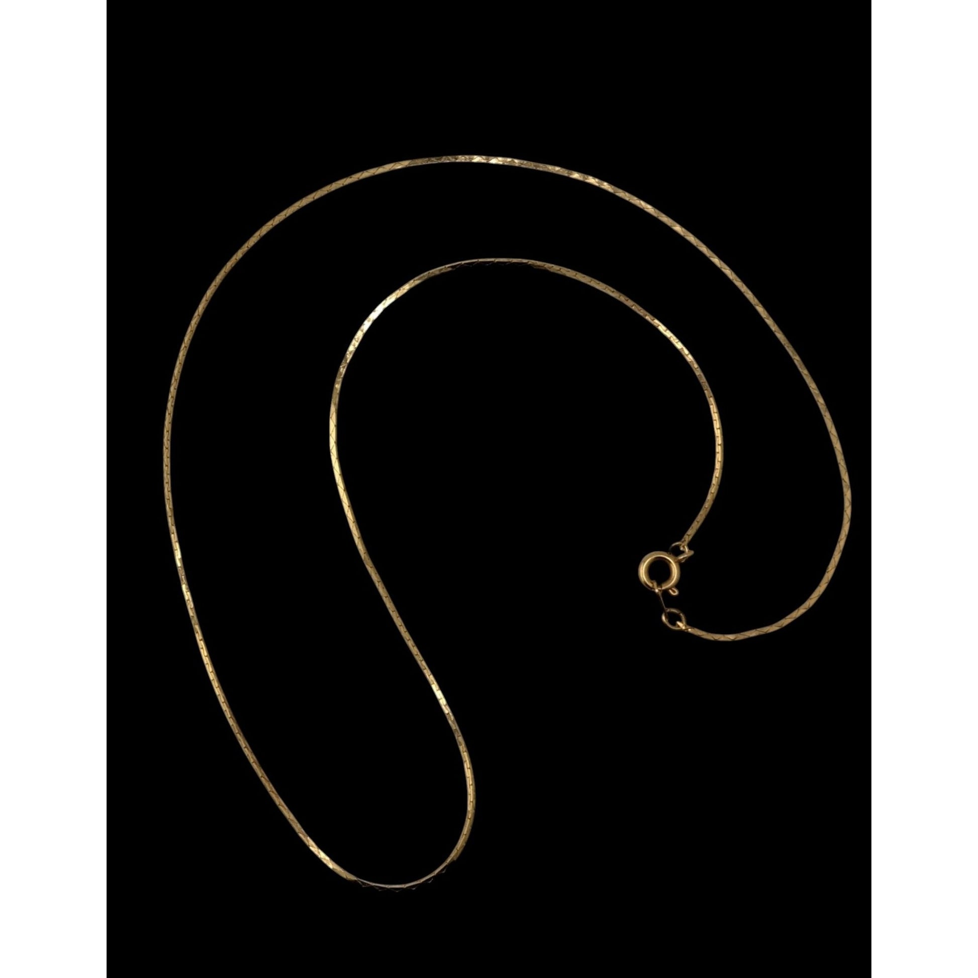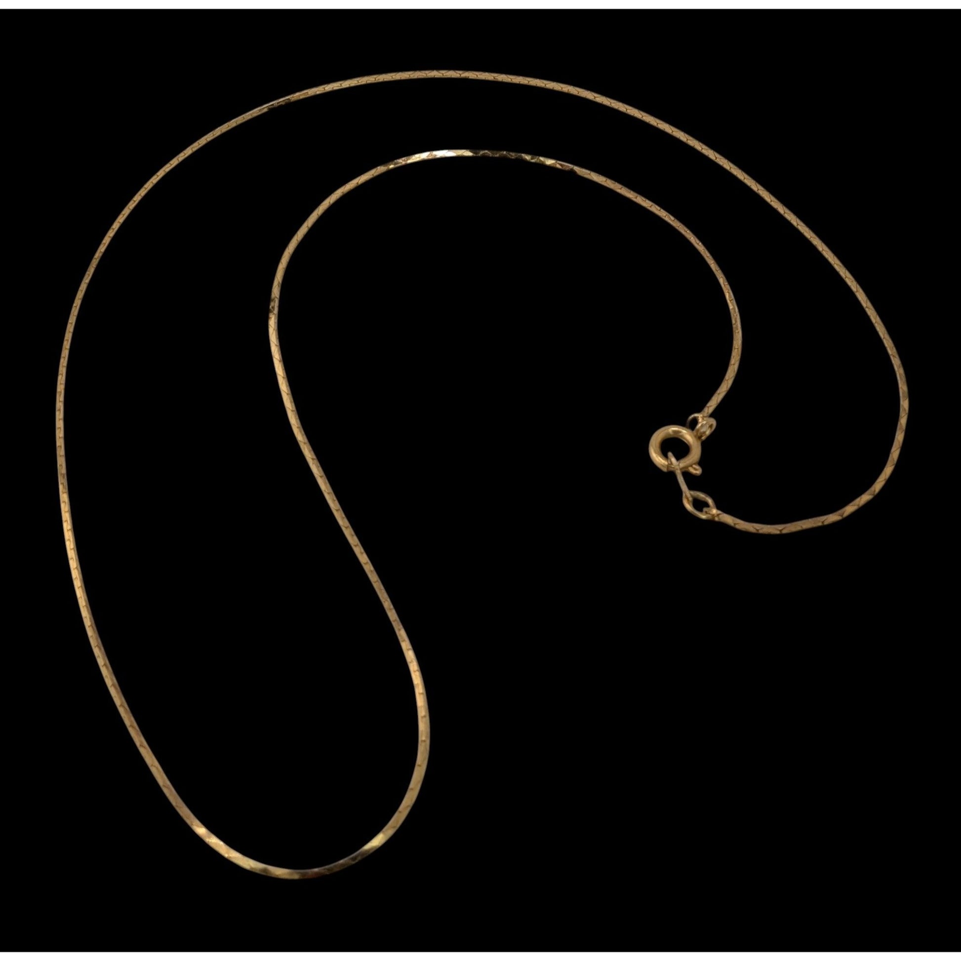 This elegantly crafted flat snake chain necklace shimmers beautifully with its gold-tone finish. At 18 inches, it’s a delicate yet striking accessory, secured by a reliable spring ring clasp. A timeless piece for enhancing your style effortlessly.