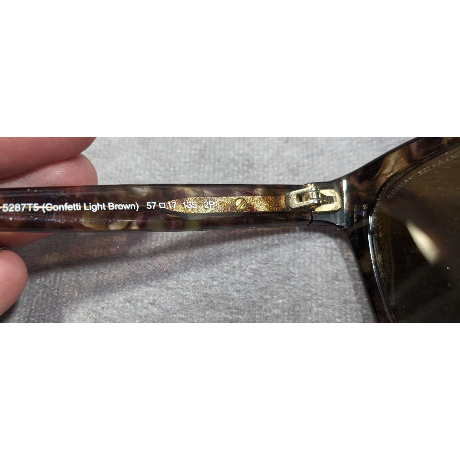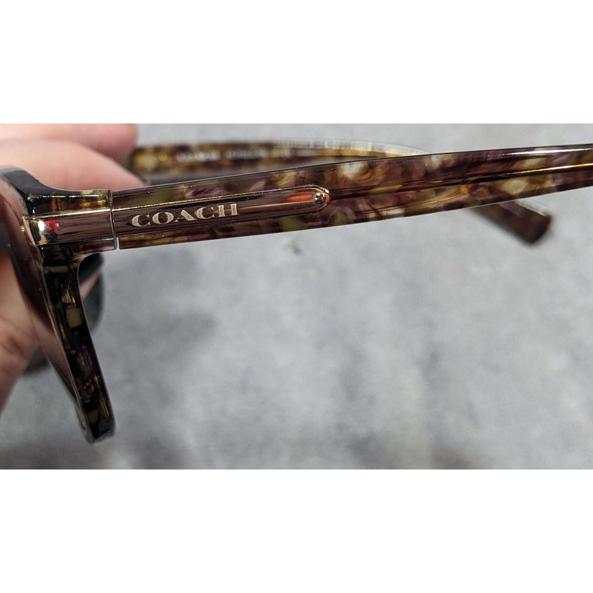 Stylish Coach Confetti sunglasses featuring a light brown frame with polarized lenses. Comes with a protective case for easy storage. Perfect for sunny days and outdoor adventures.