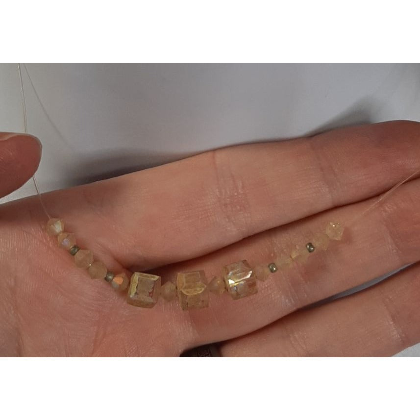 Each bead tells a story of artisan craft and elegance. The distressed gold-tone beads shimmer delicately on a clear cord, perfect for layering or solo wear.