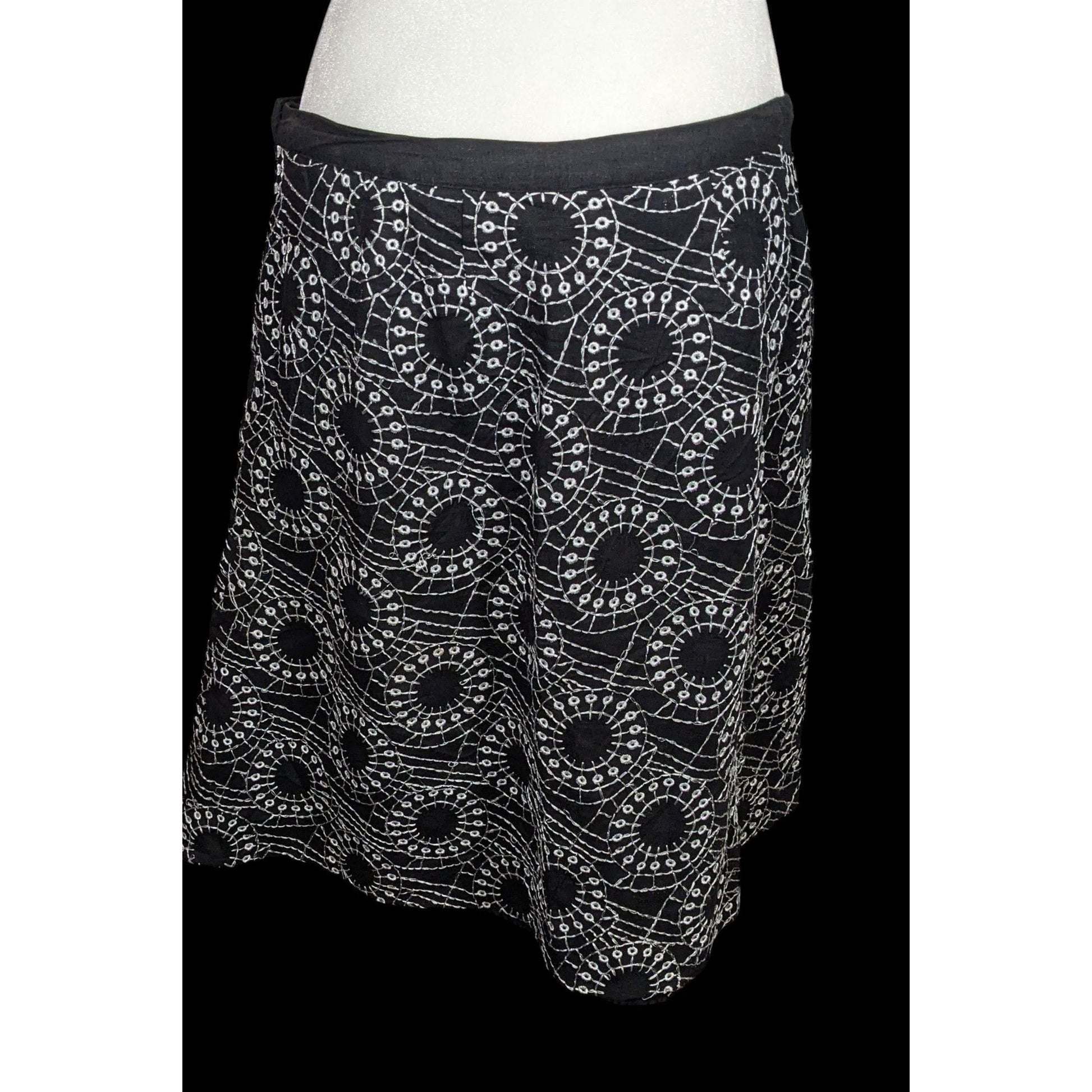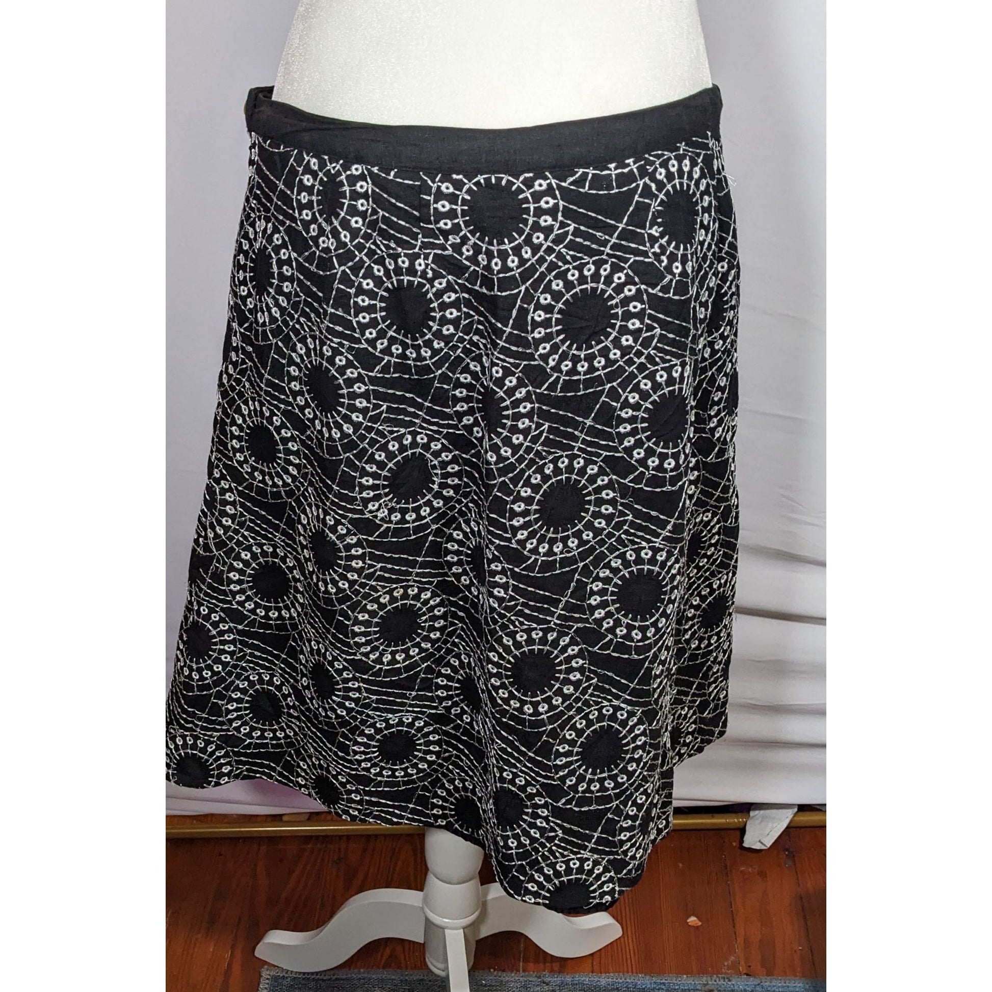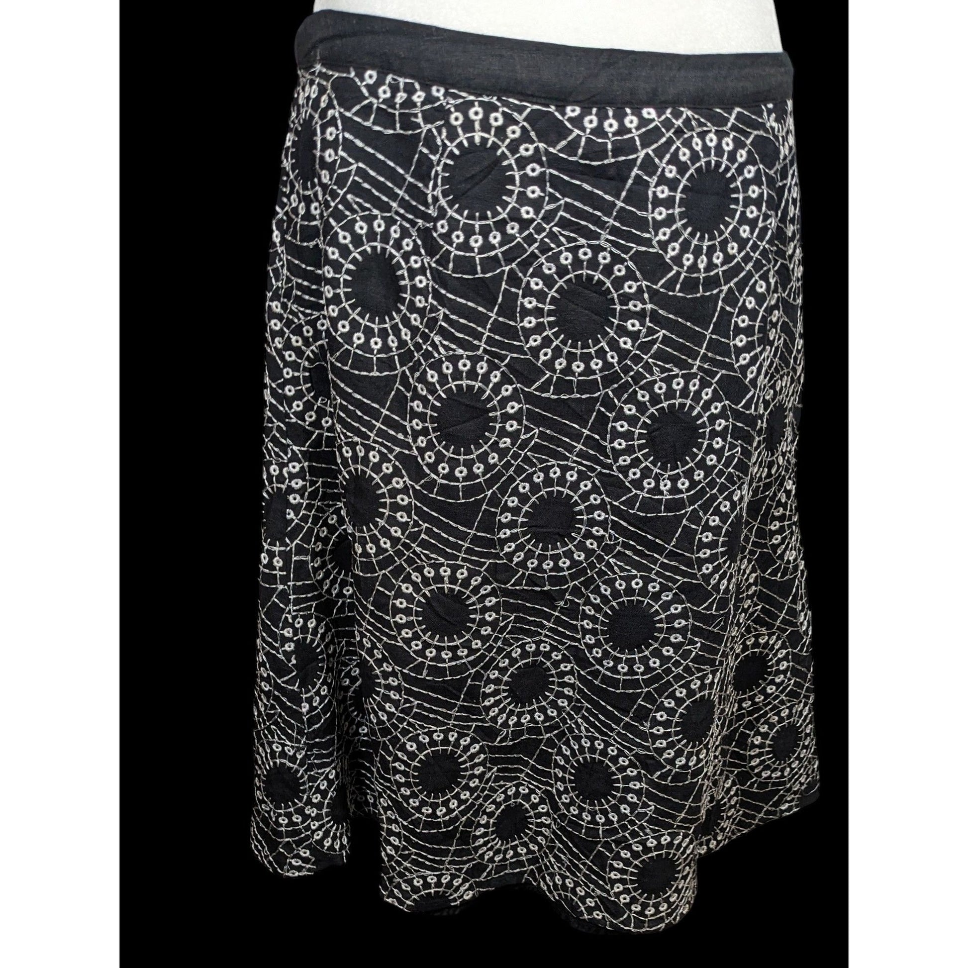 Elegant bohemian skirt featuring intricate black and white embroidery. Perfect for adding a touch of sophistication to any outfit.