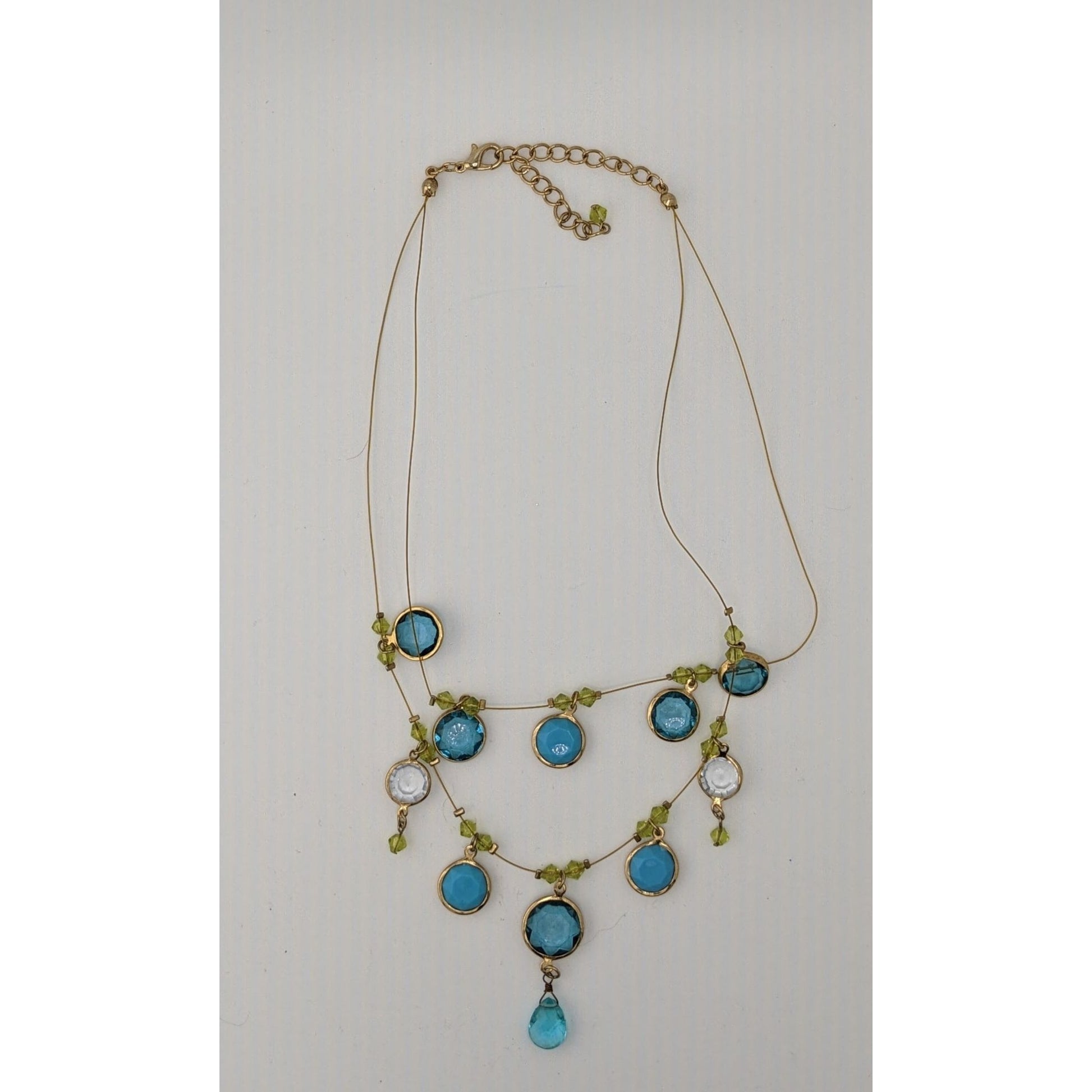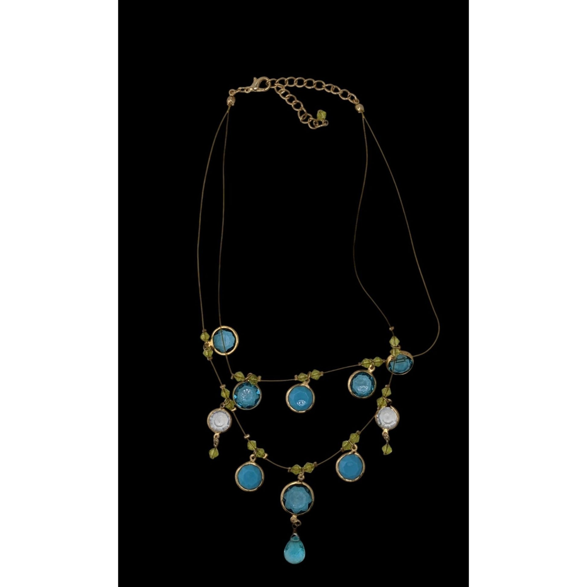 This delicate necklace tells a story of elegance and charm. Its shimmering blue and green acrylic gems evoke the beauty of nature, while the adjustable gold-tone wire gracefully frames your neckline. A teardrop pendant completes this eye-catching piece, perfect for adding a touch of sophistication to your ensemble.