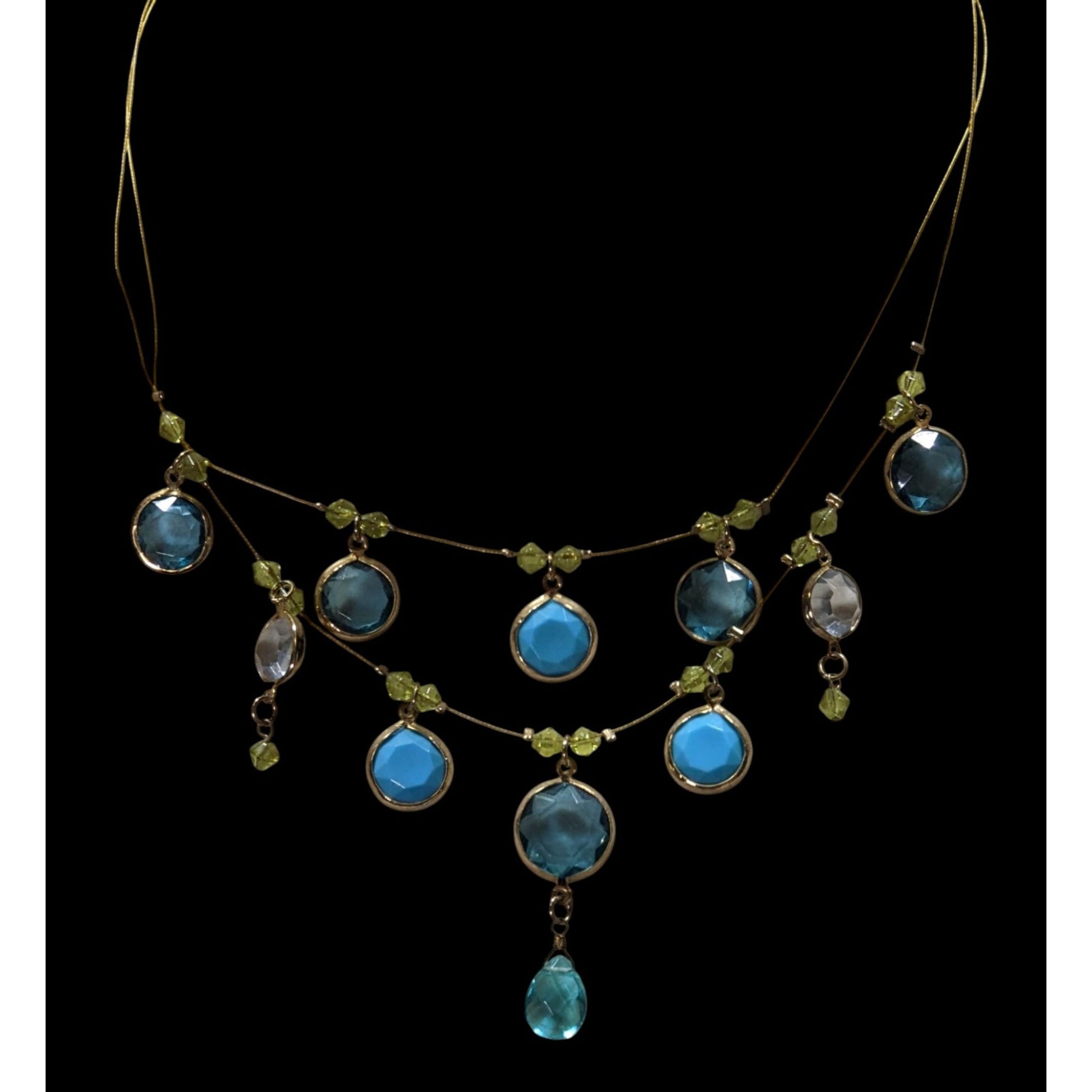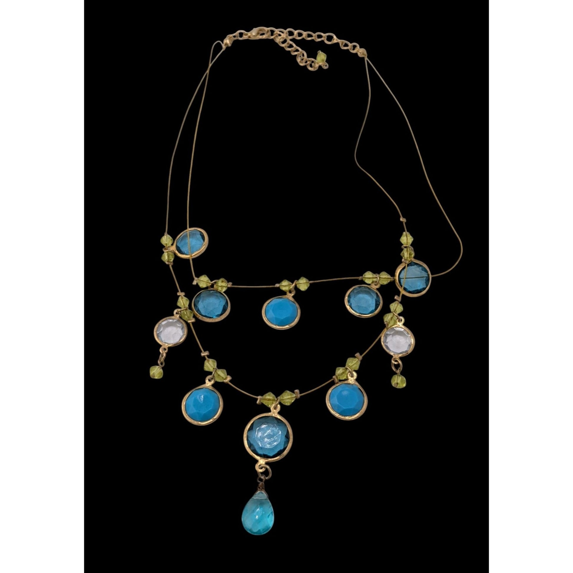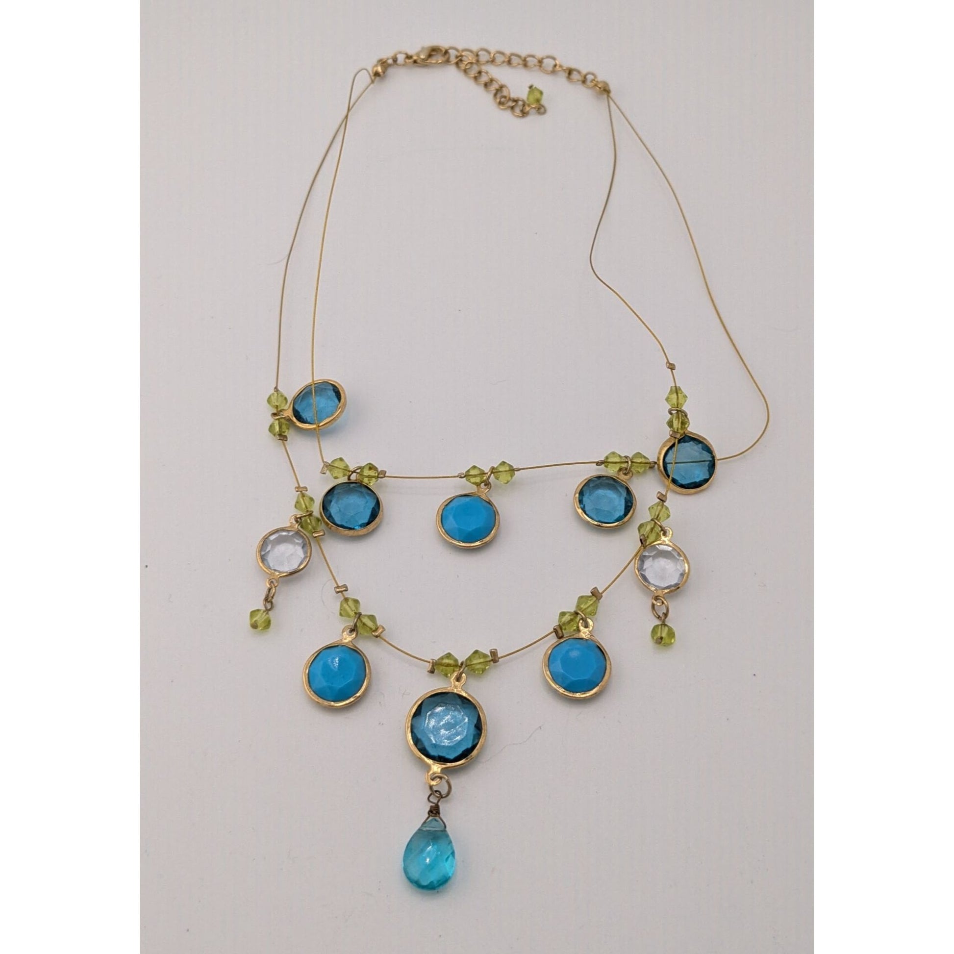 Elegant Blue And Green Gemmed Gold Tone Wire Necklace