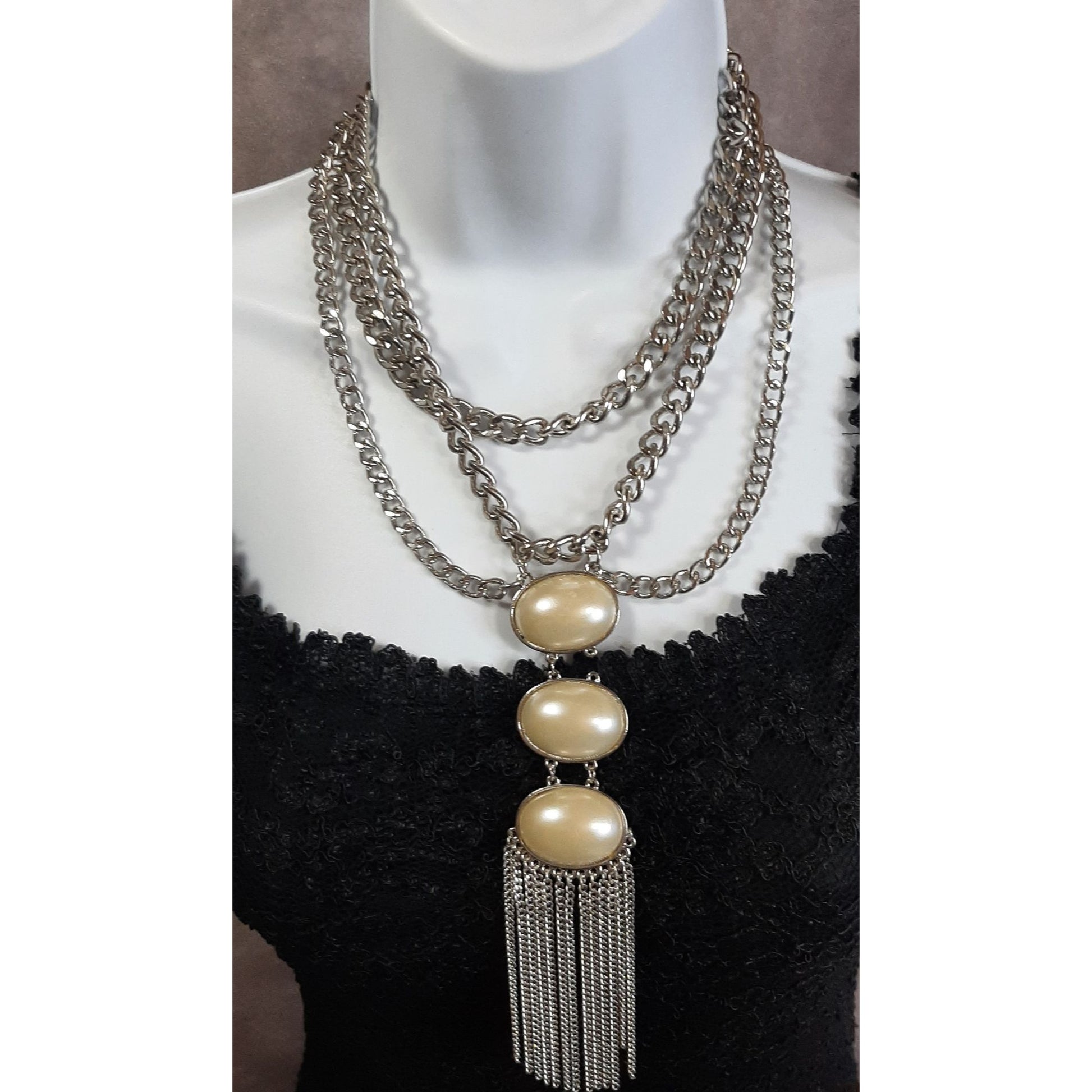 Elegant Layered Silver Statement Necklace With Faux Pearl Cabochons And Tassel Pendant