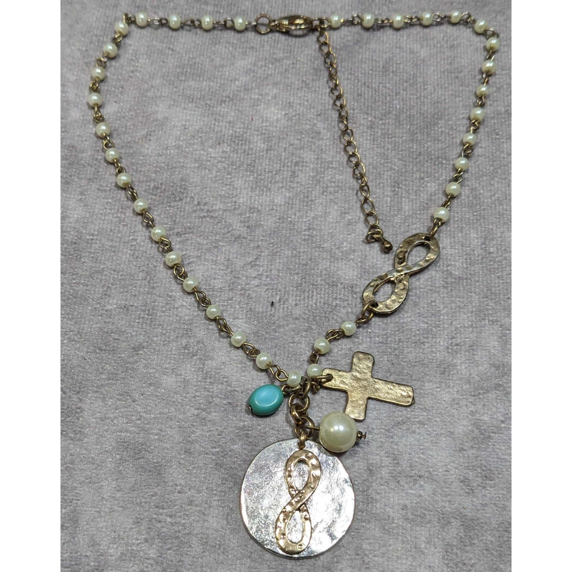 Elegant Religious Cross And Infinity Charm Necklace With Faux Pearl Accents