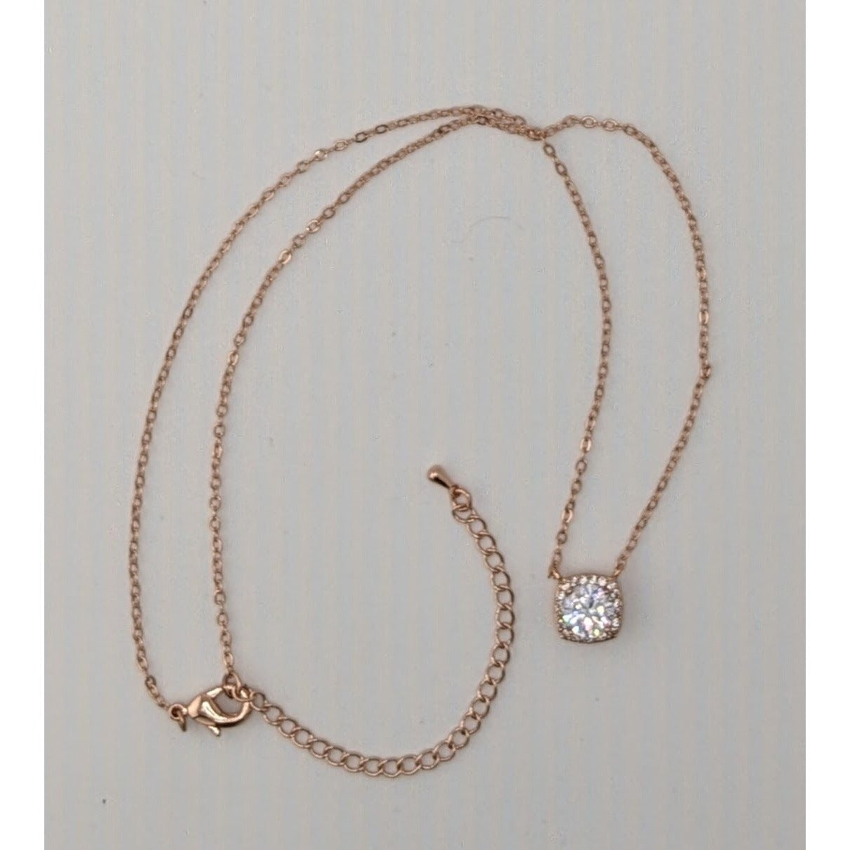 This rose gold tone necklace tells a story of timeless elegance. Its delicate chain leads to a dazzling cushion-cut gem pendant that catches every light, radiating brilliance. The main stone is surrounded by a ring of smaller stones. The adjustable clasp ensures a perfect fit, while the minimalist design adds a touch of sophistication to any ensemble.