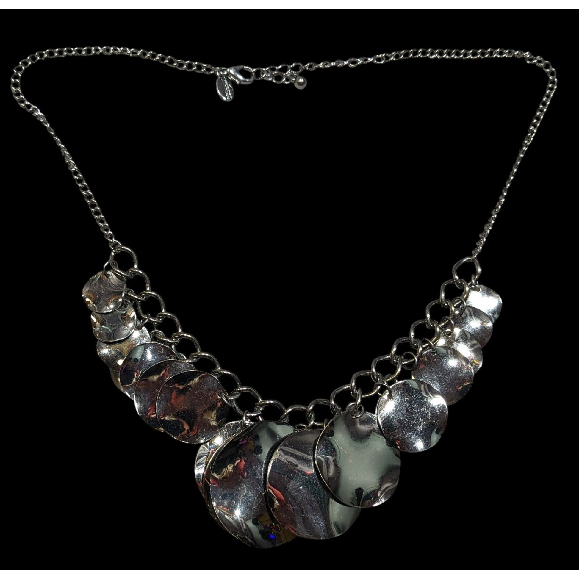 Elevate your style with this expressive abstract necklace featuring graduated disc fringe in a striking gunmetal tone. Perfect for making a bold statement.