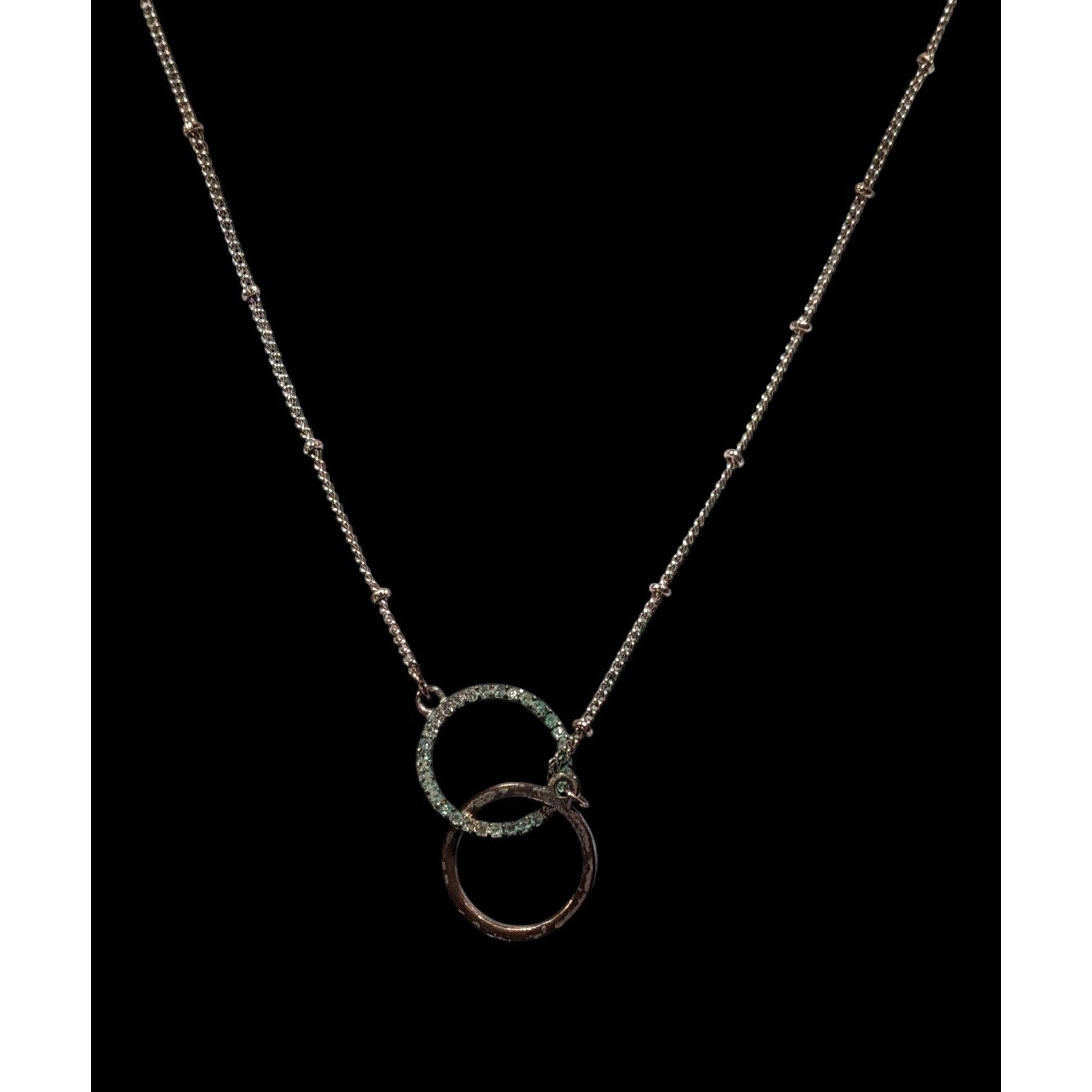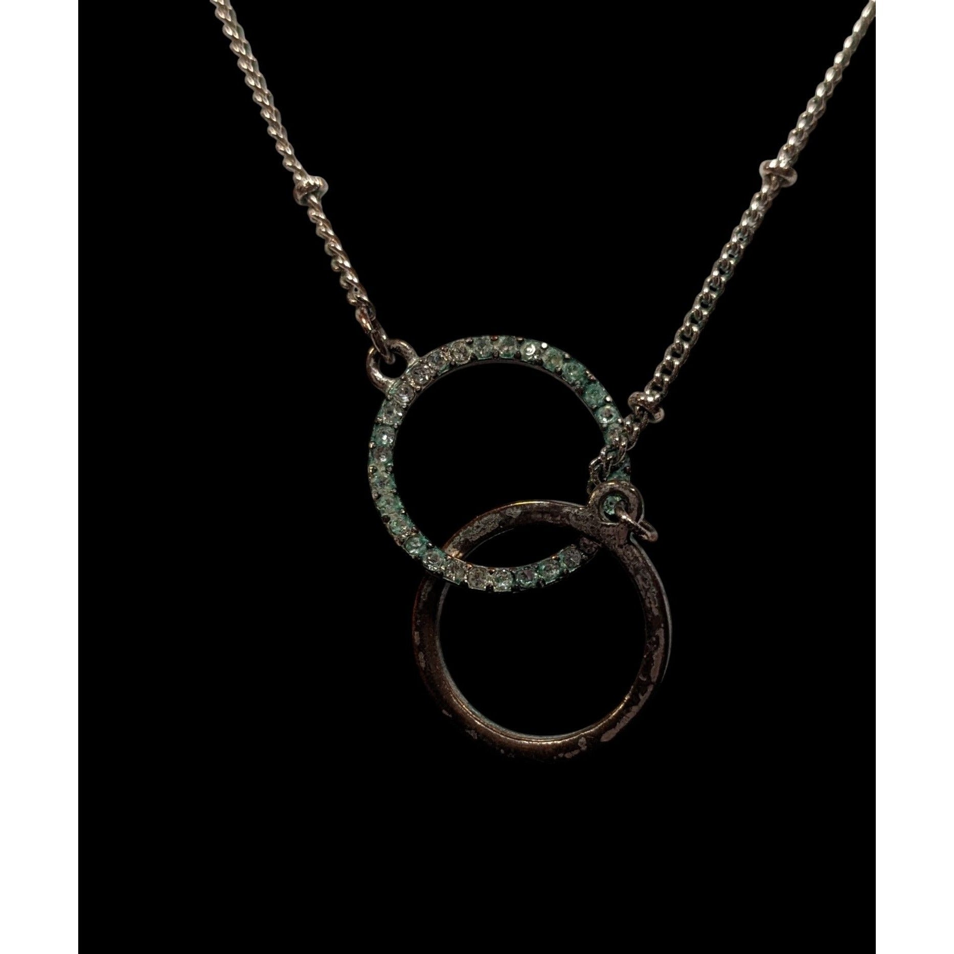 Elegant and versatile, this minimalist silver-tone necklace features a unique double ring design adorned with sparkling rhinestones. Perfect for both casual and formal occasions, it adds a touch of sophistication to any outfit.