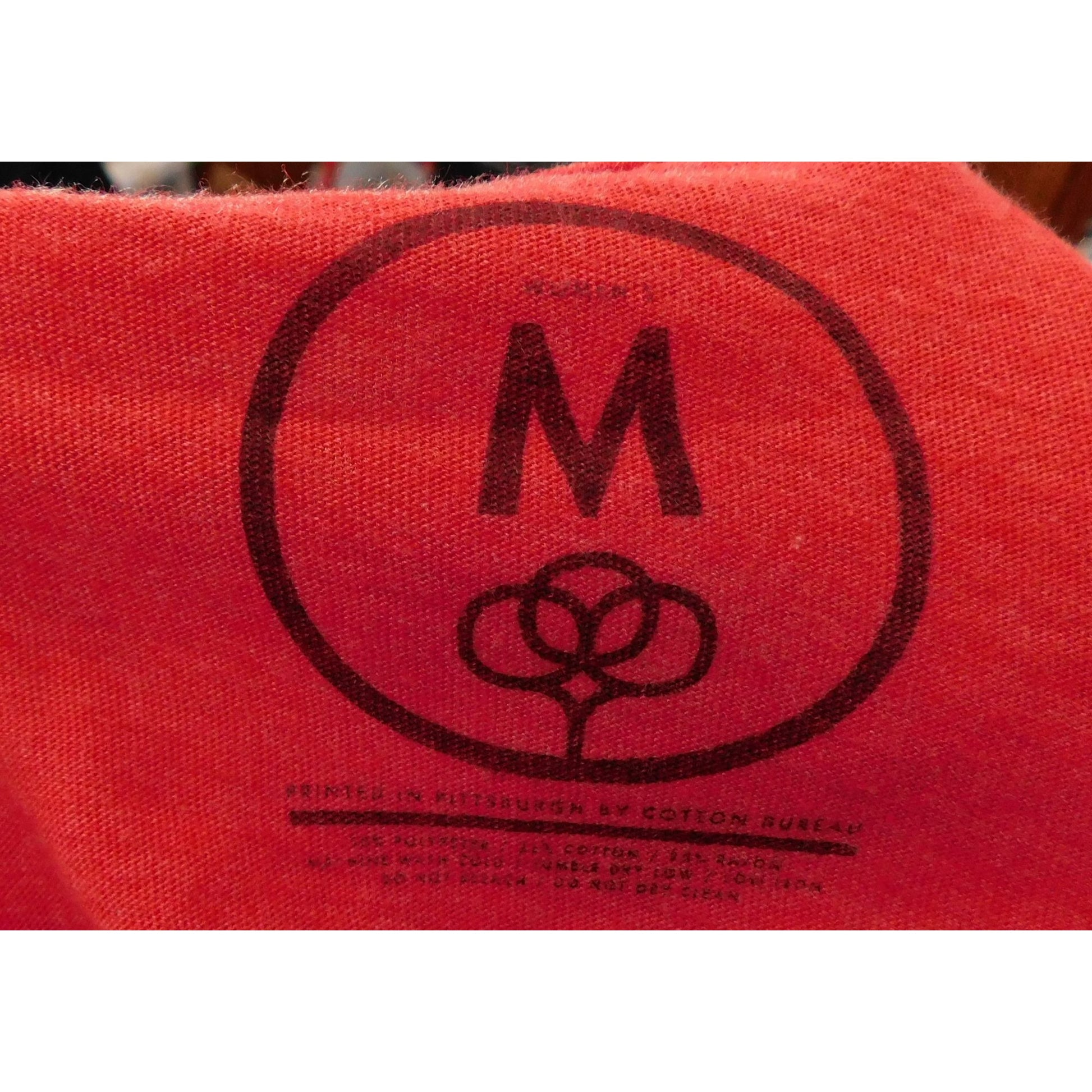 Fun and unique Fraternal Order of Pizza tee printed by Cotton Bureau in Pittsburgh PA. It's in a super soft, super stretchy red fabric. It has a pentagram printed on the front that says "Fraternal Order of Pizza" in the circle around the outside, and "Crusts Confidus" on the inner circle. The points of the star are designed to look like pepperoni pizza slices, with pepperonis, and cheese dripping down the slices. The inside has a shield with wheat stalks, pepperonis, a tomato, and an eye.