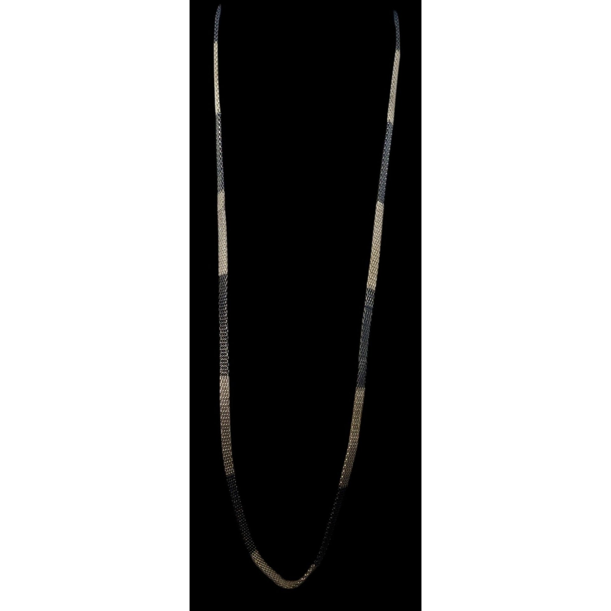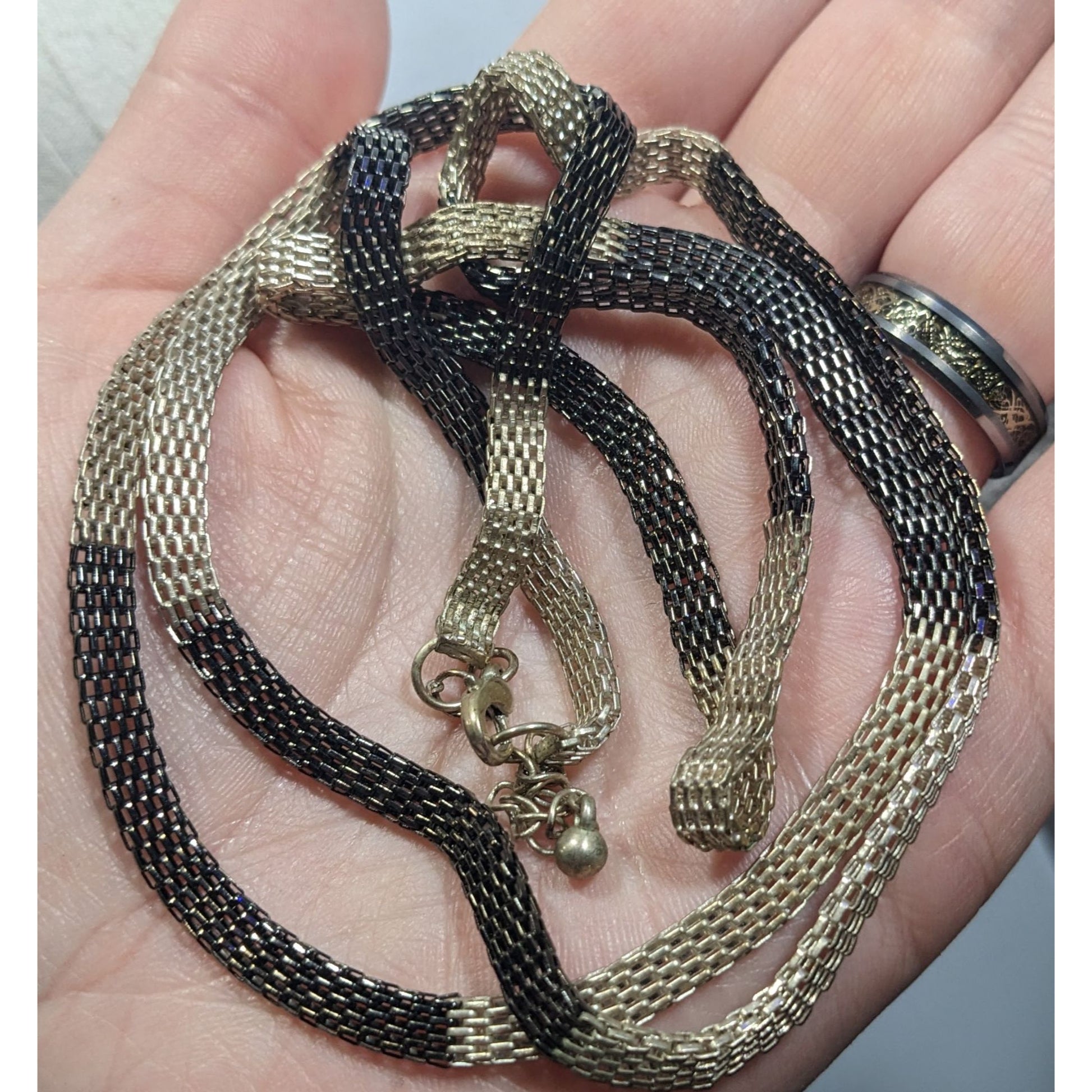 Add a touch of edgy elegance to your outfit with this funky black and silver mesh chain necklace. Perfect for making a bold statement, this necklace is both versatile and stylish. Ideal for day or night wear.