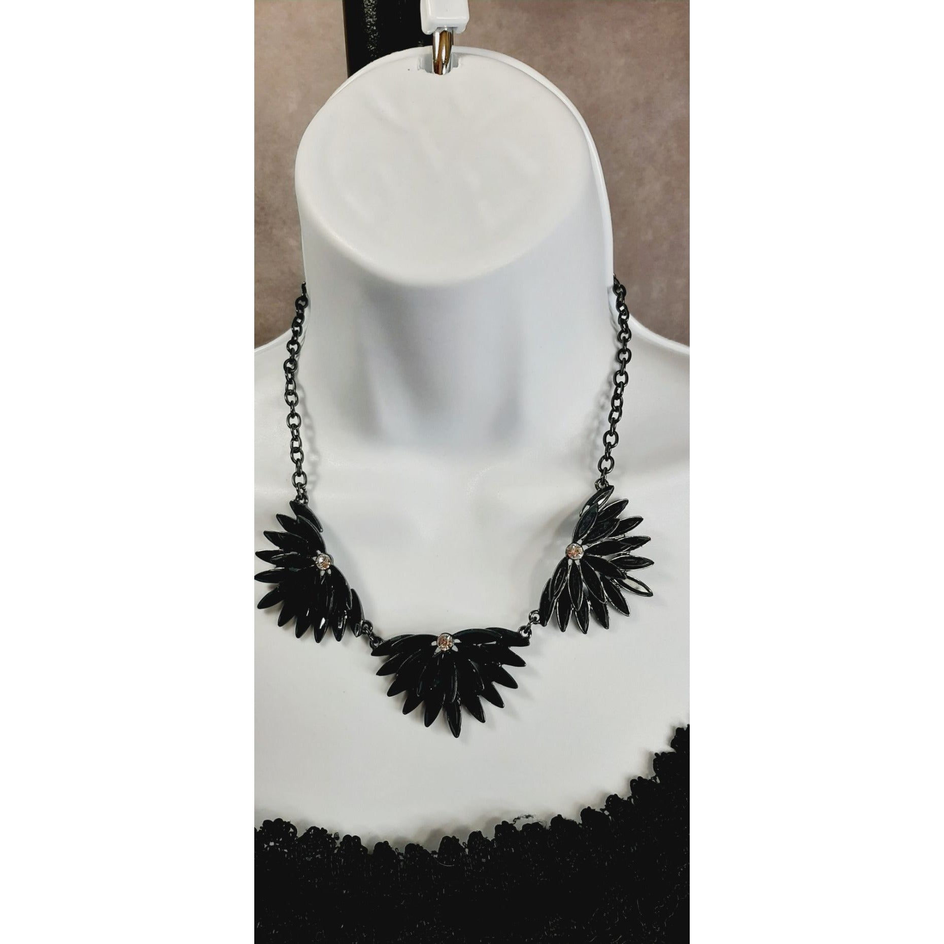 Adorn yourself with this striking wing-shaped necklace, where glossy black accents meet shimmering rhinestones. The adjustable chain ensures a comfortable, versatile fit, adding a bold, elegant touch to any outfit.