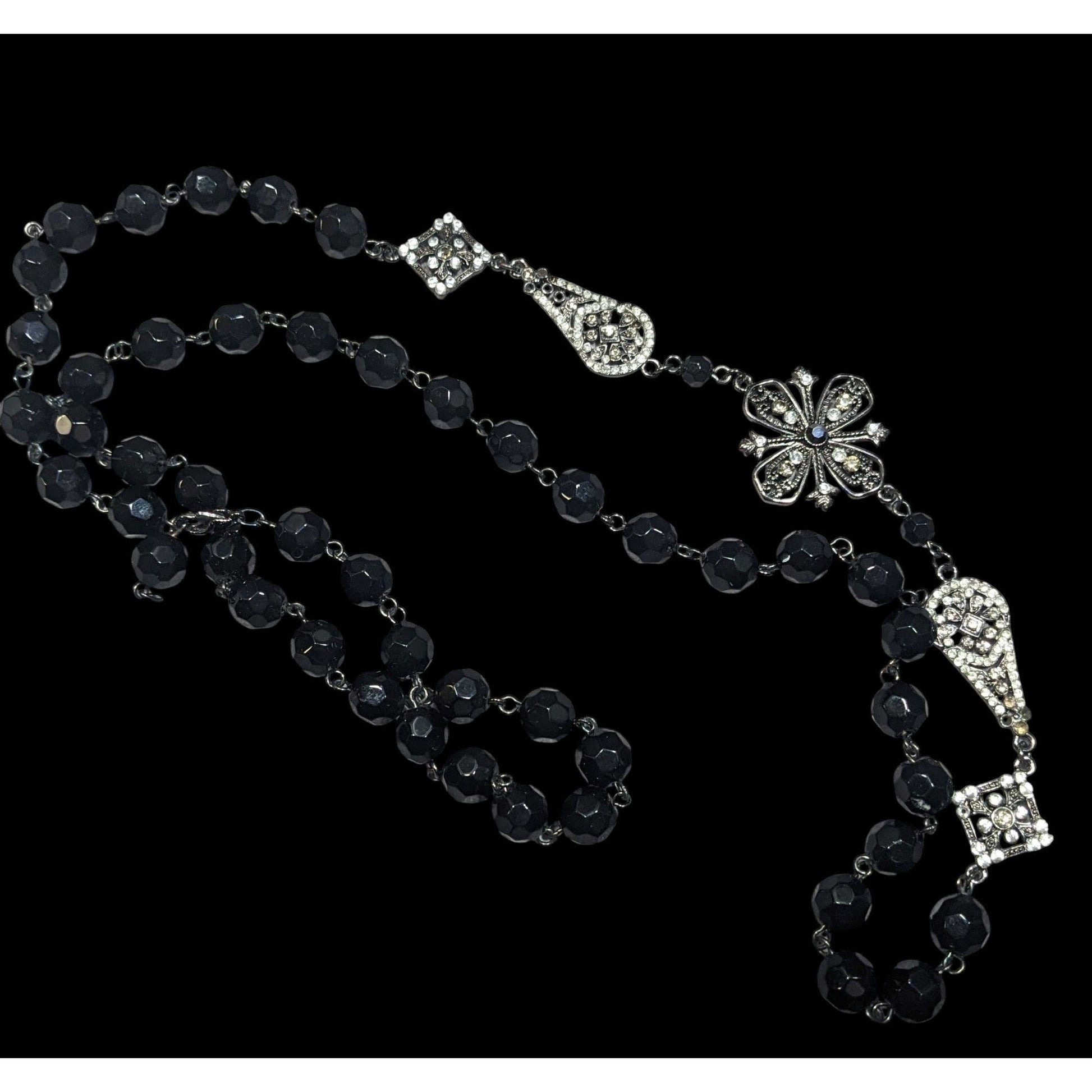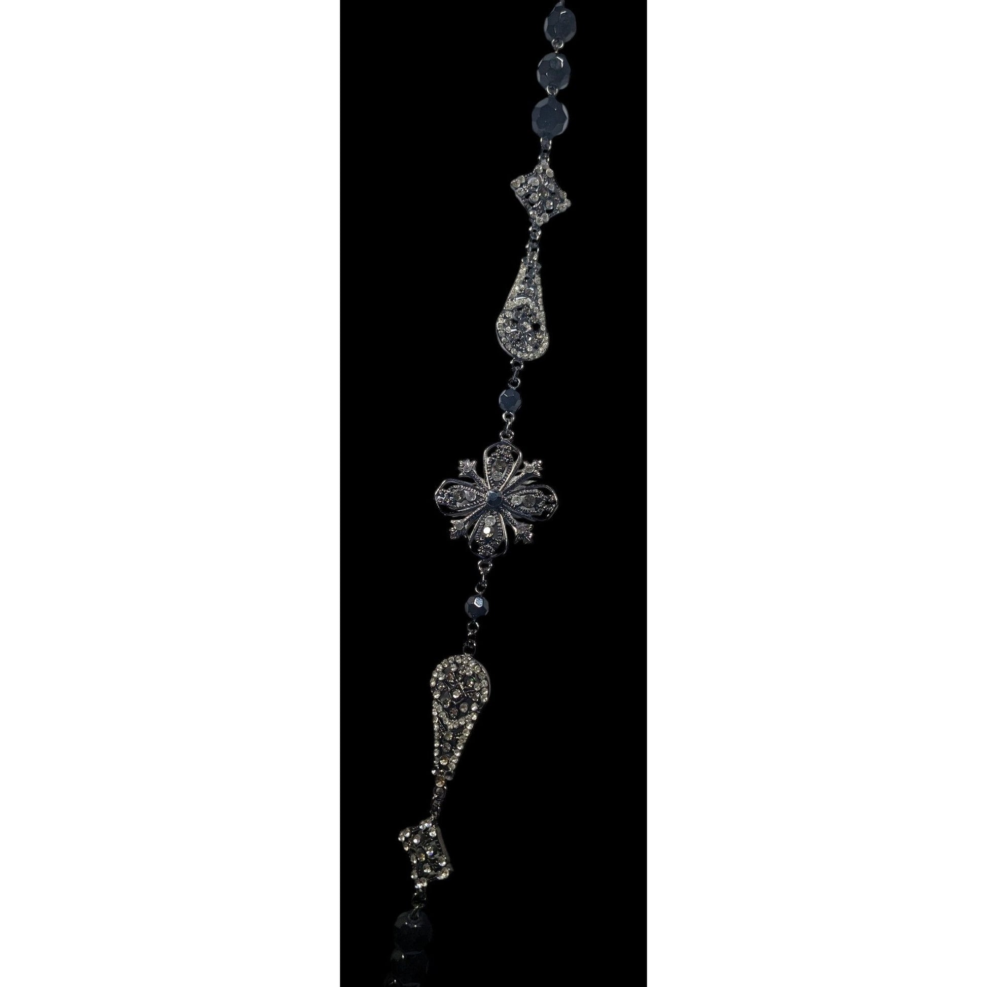 Glam Goth Floral Rhinestone Accented Black Beaded Opera Necklace