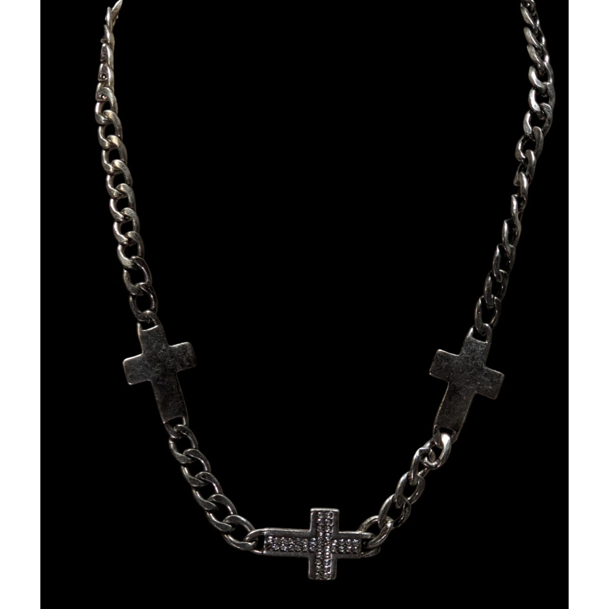 Elevate your style with this Glam Goth Triple Cross Necklace, featuring exquisite rhinestone accents for a bold, statement-making look. Perfect for adding a touch of edgy elegance to any outfit.