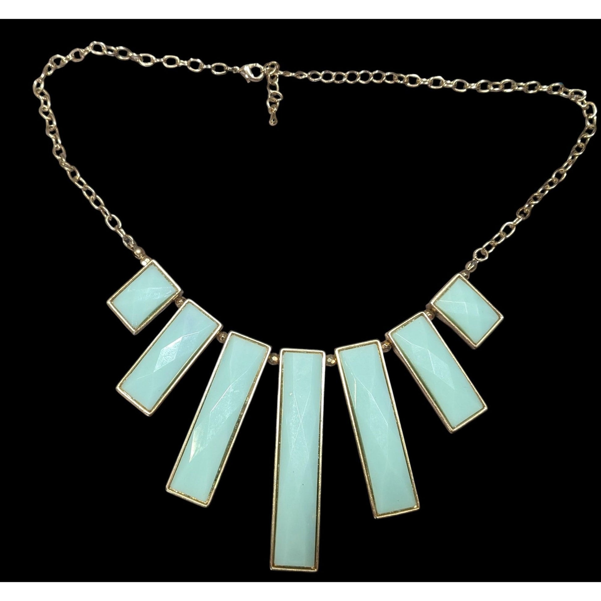 Elegant graduated pillar bib necklace featuring pastel blue gems and gold-tone metal, perfect for adding sophistication to any outfit. Ideal for special occasions or everyday wear.