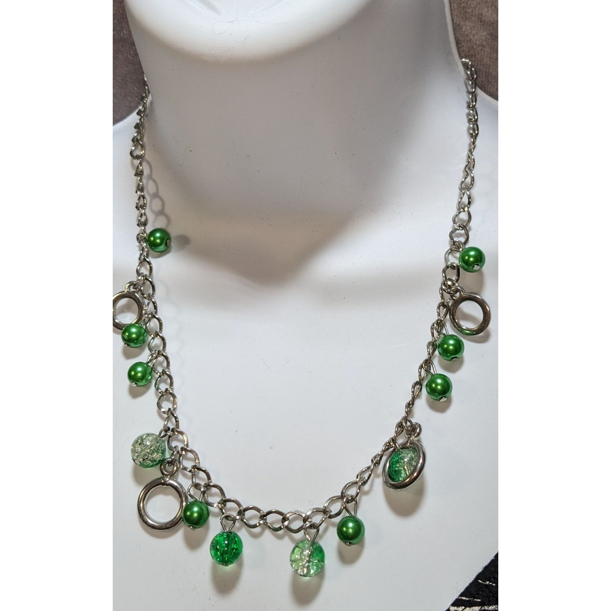 This eye-catching necklace tells a story of elegance with its silver chain adorned with green beads and circular charms. The lobster clasp ensures a secure fit, while its 22-inch length complements any neckline gracefully. A perfect blend of simplicity and charm.