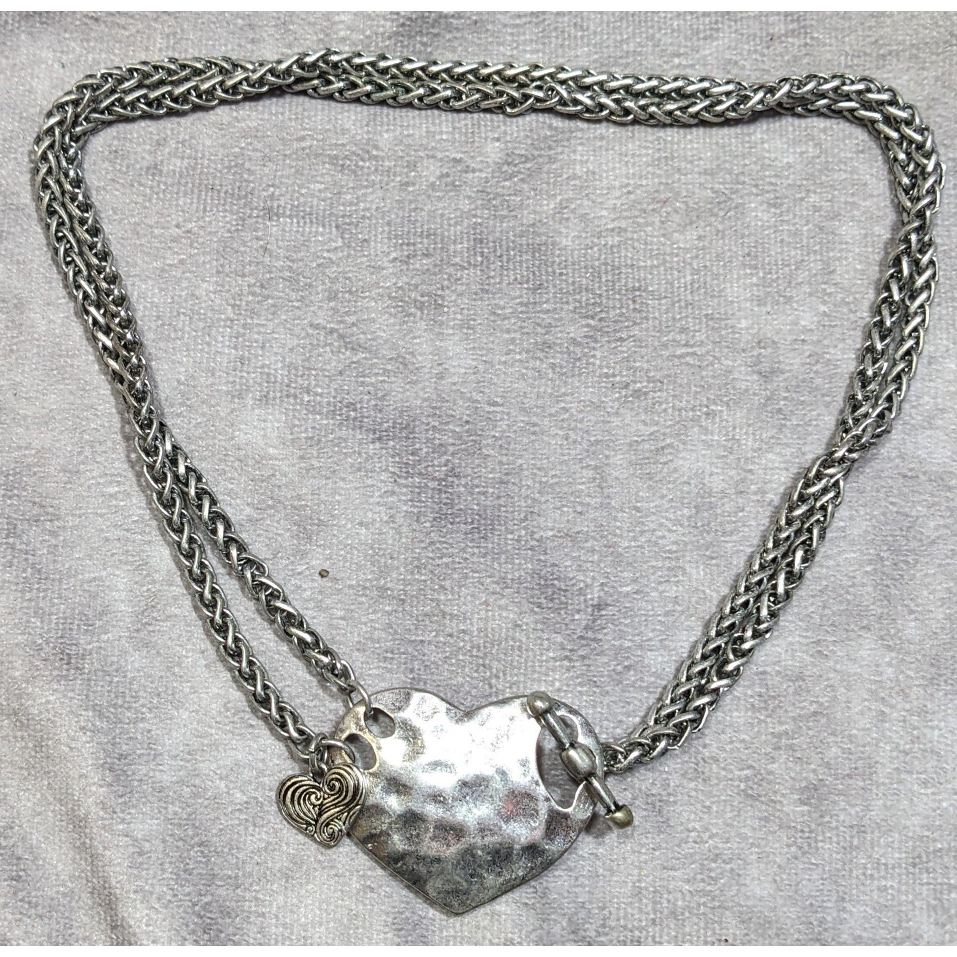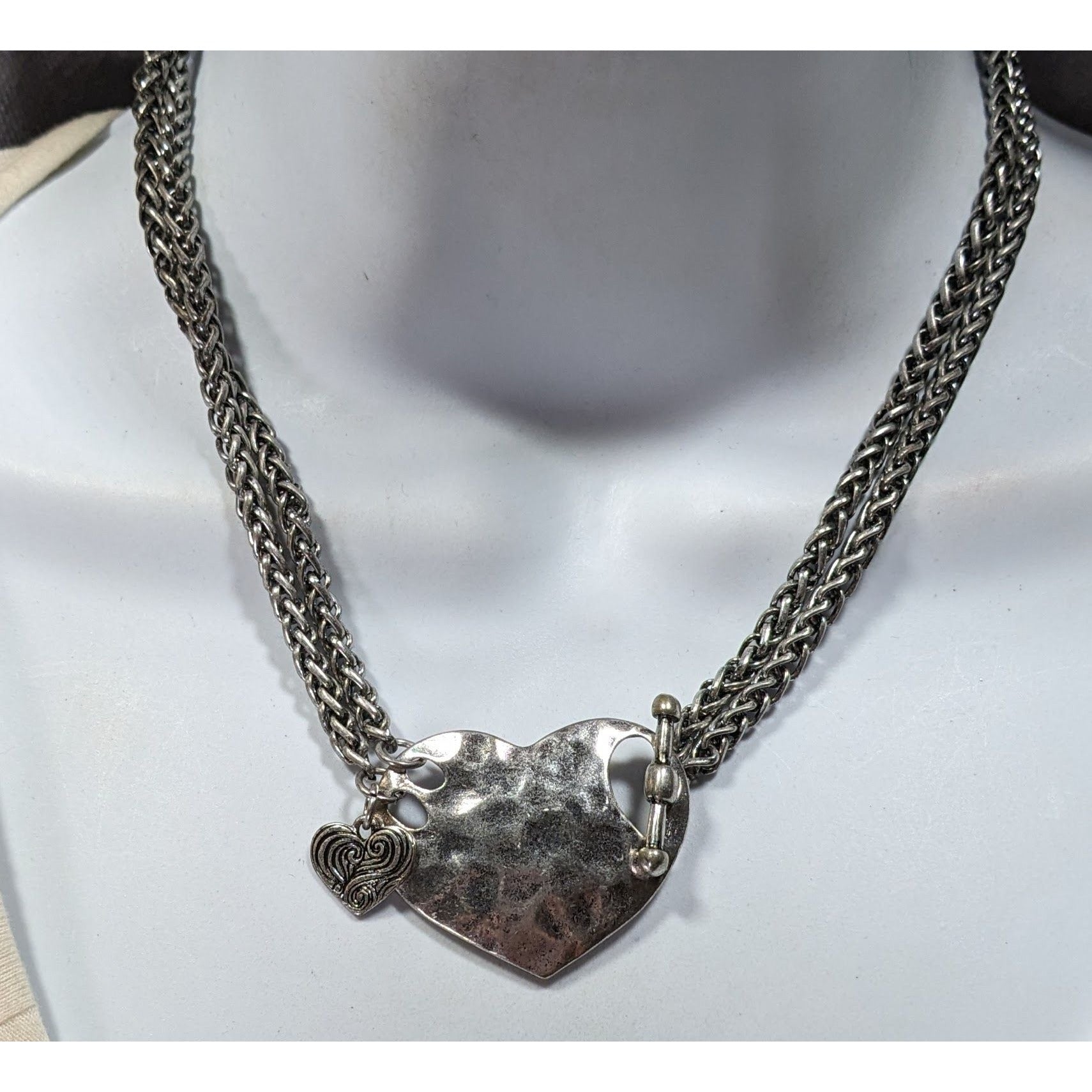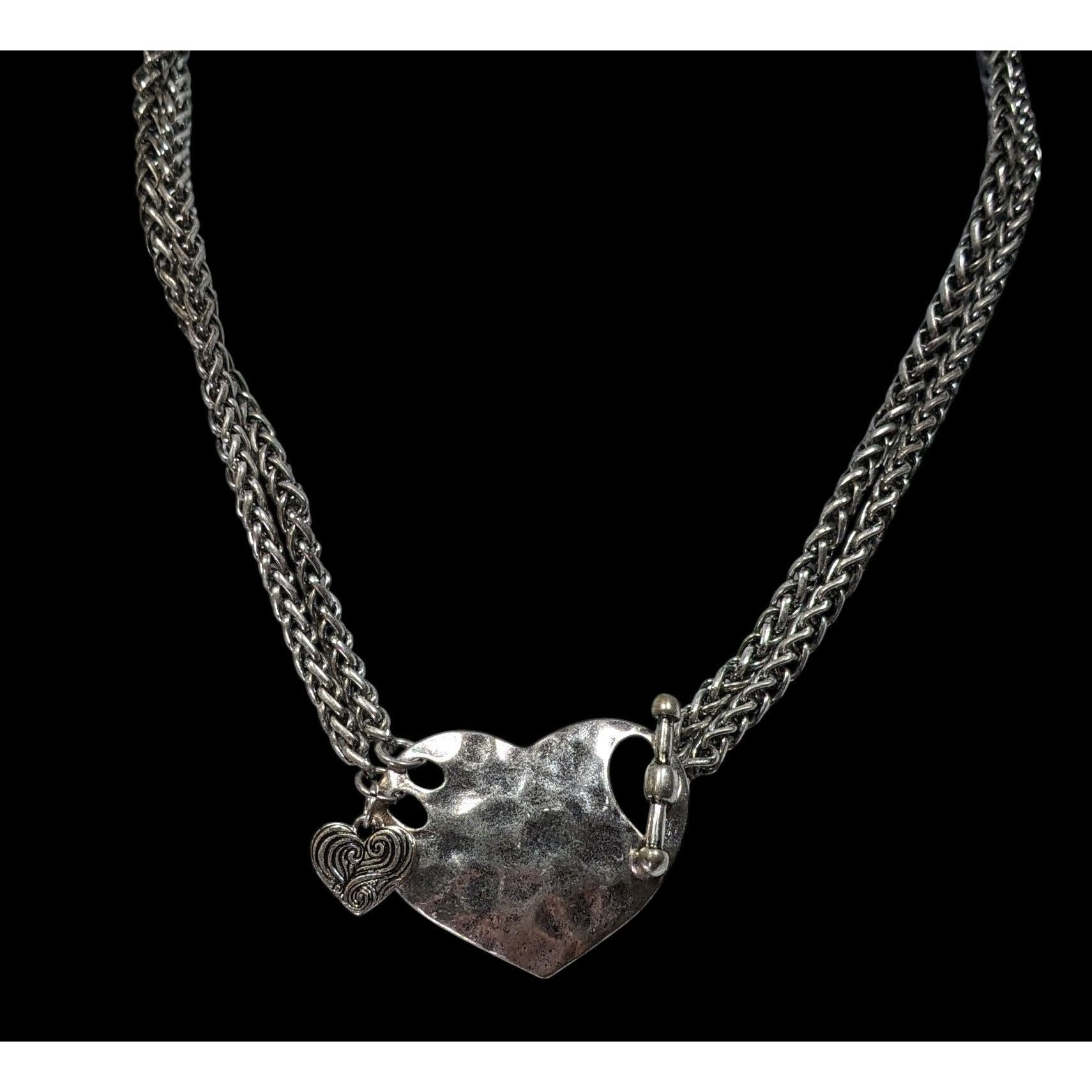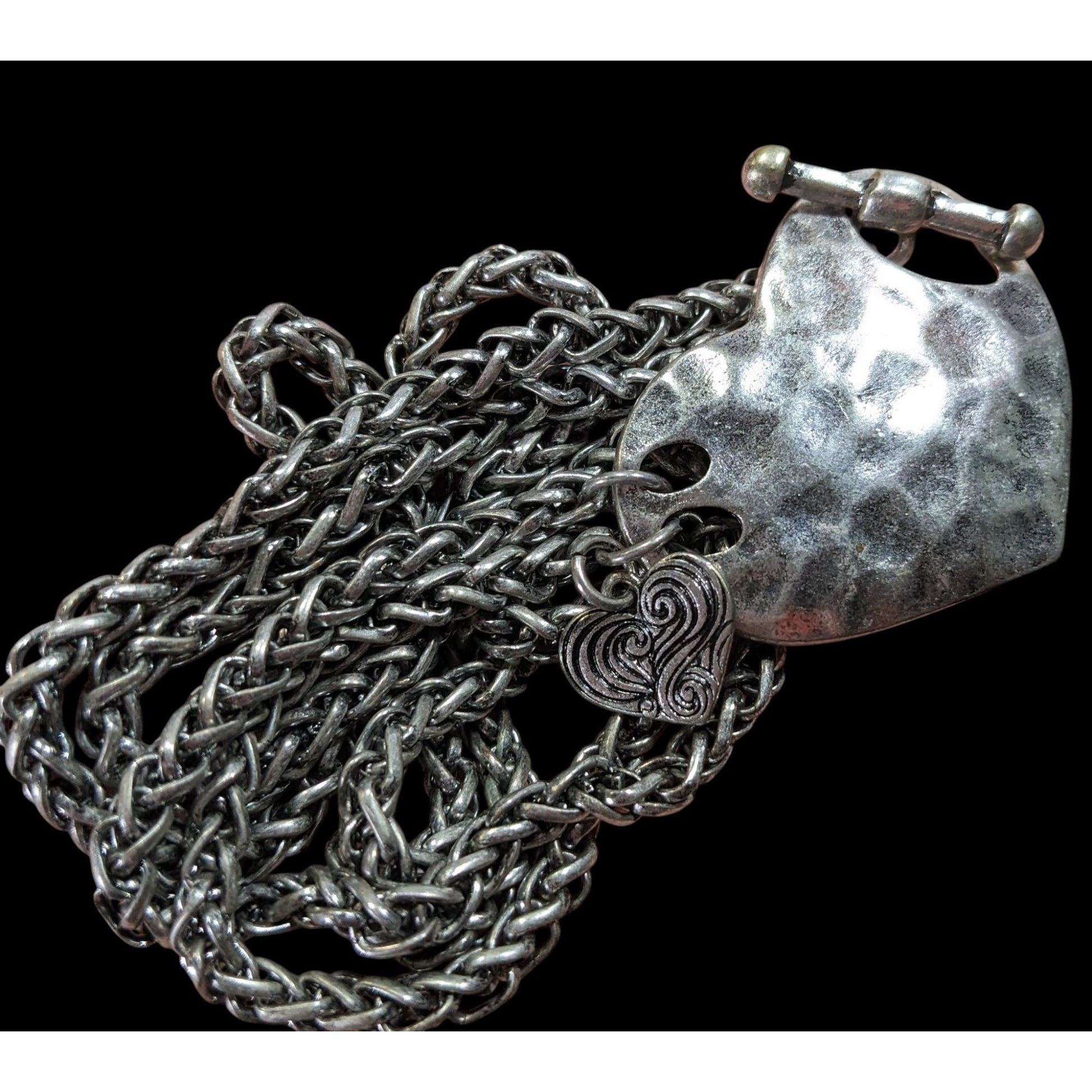 Hammered Love Themed Silver Tone Heart Pendant Toggle Necklace