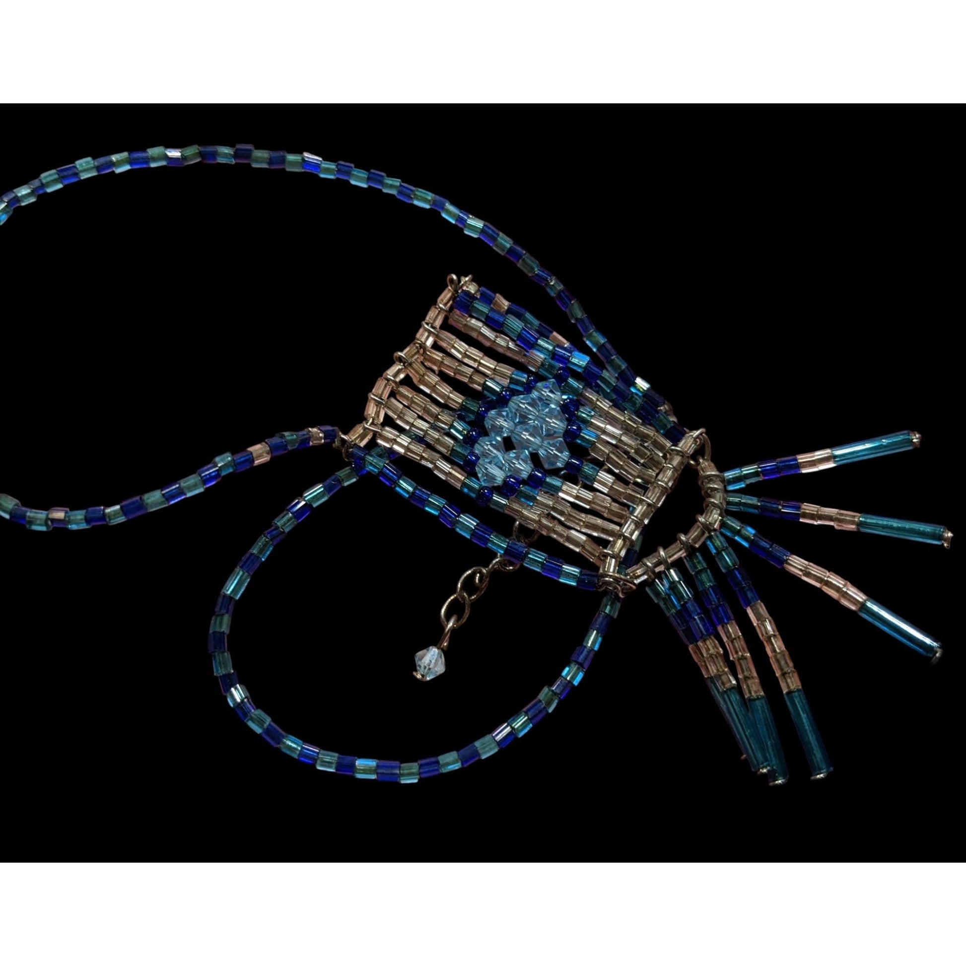 This necklace whispers tales of artistry, with blue and silver beads woven into a pendant that dances like cascading waterfalls. Its adjustable chain fits gracefully, promising a touch of elegance for those who cherish unique designs.