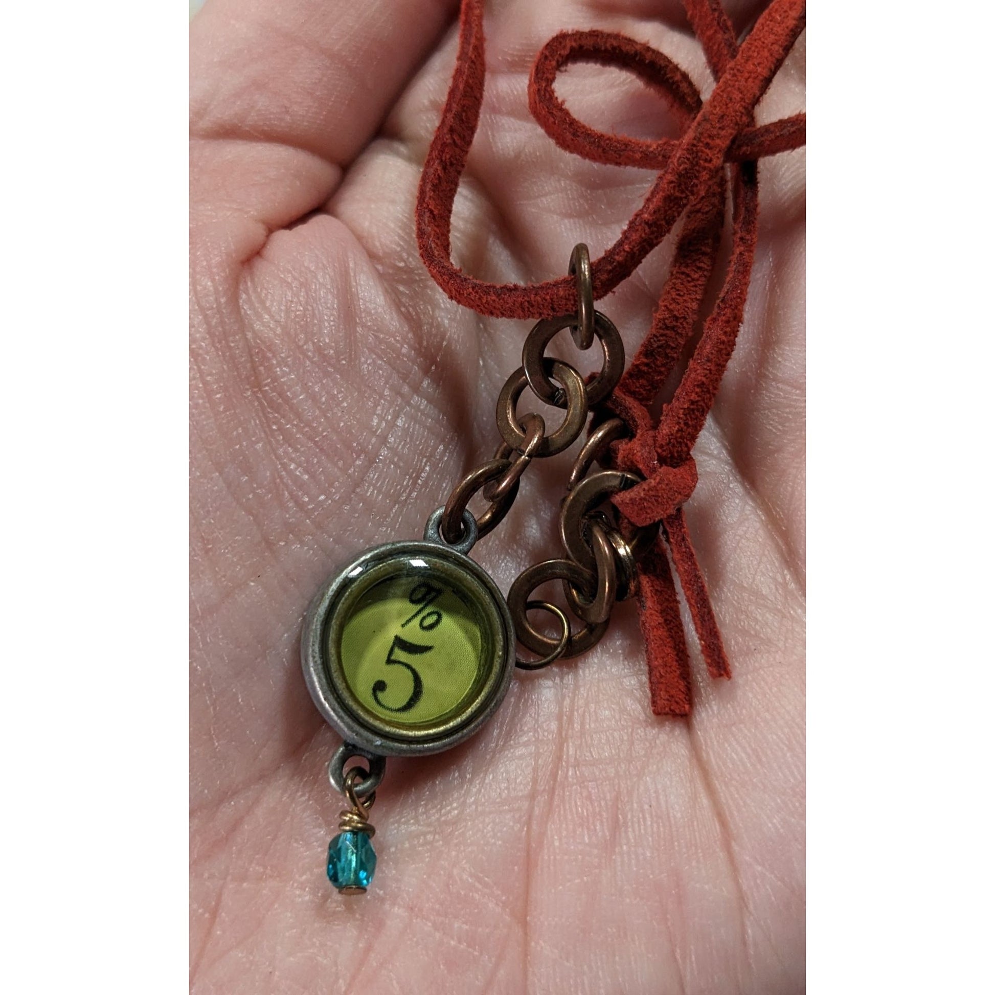 This unique necklace tells a story of whimsy and artistry, blending a rustic red suede cord with a delightful green %5 charm. Accented with a delicate blue bead drop, it evokes a sense of handmade charm and individuality, perfect for those who embrace the unconventional.