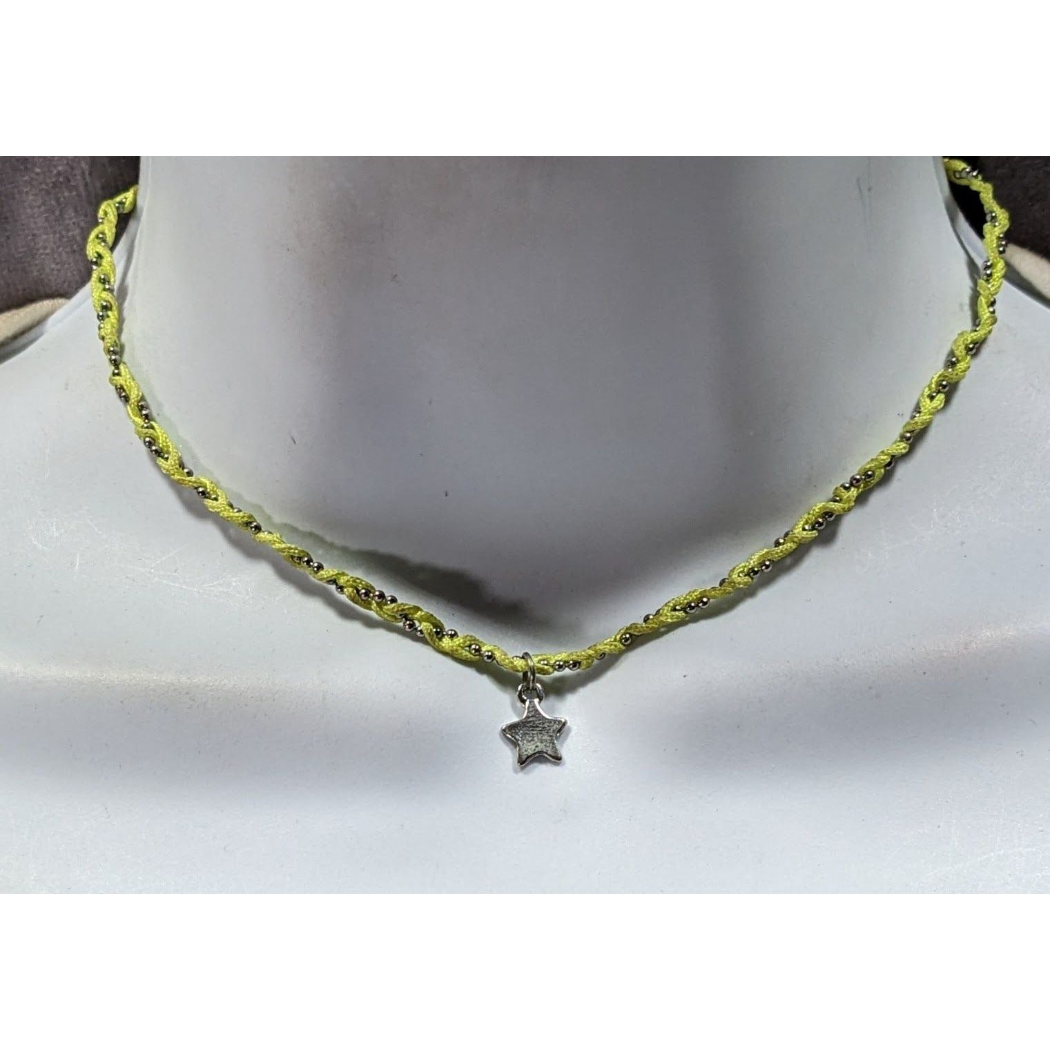 Handmade 90s Style Green And Silver Tone Braided Necklace With Star Charm