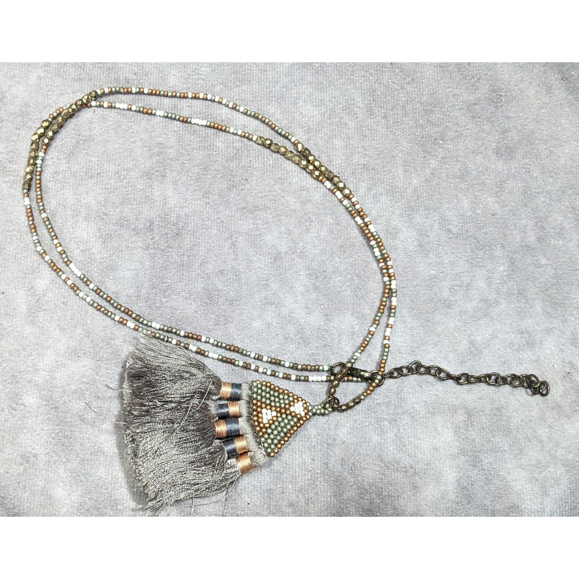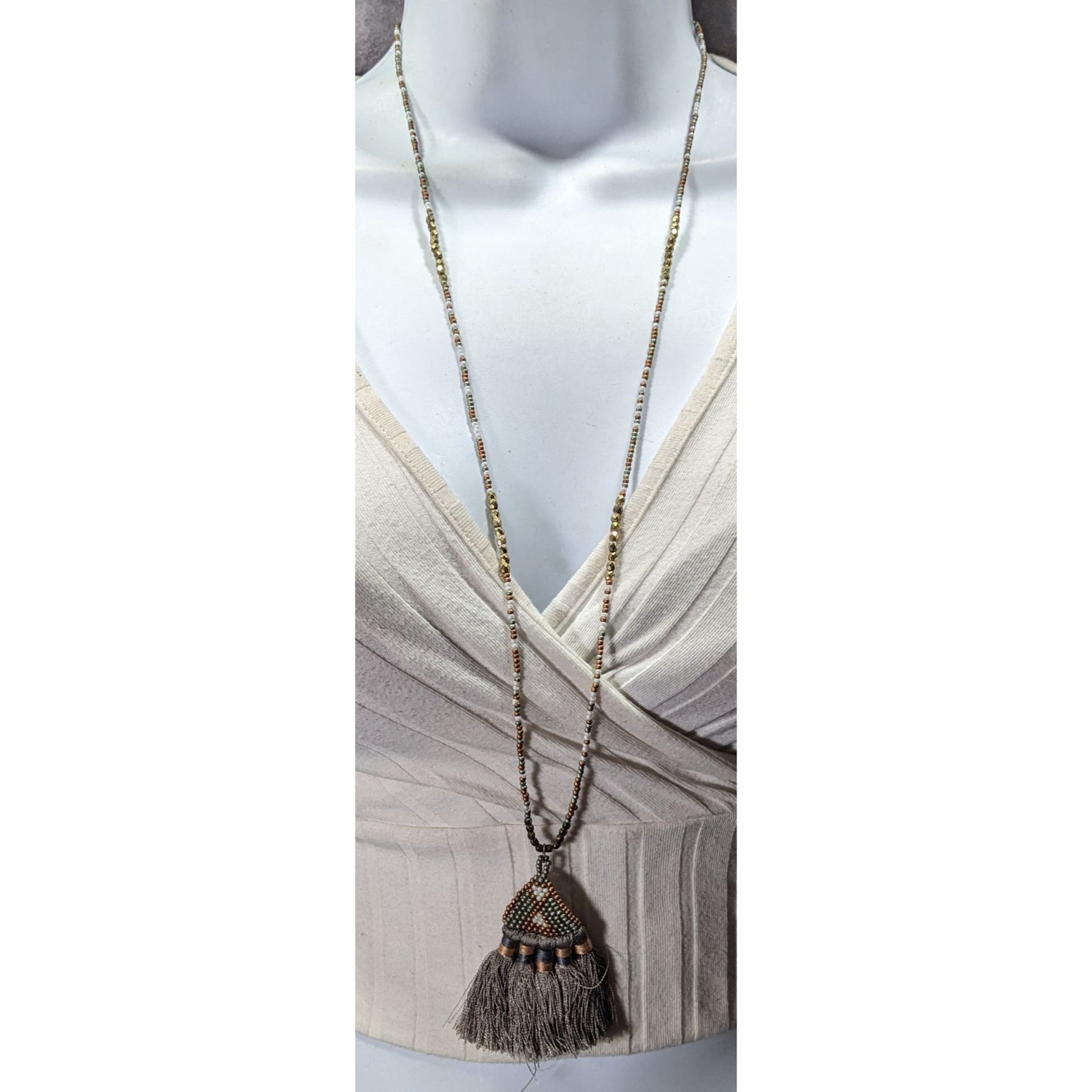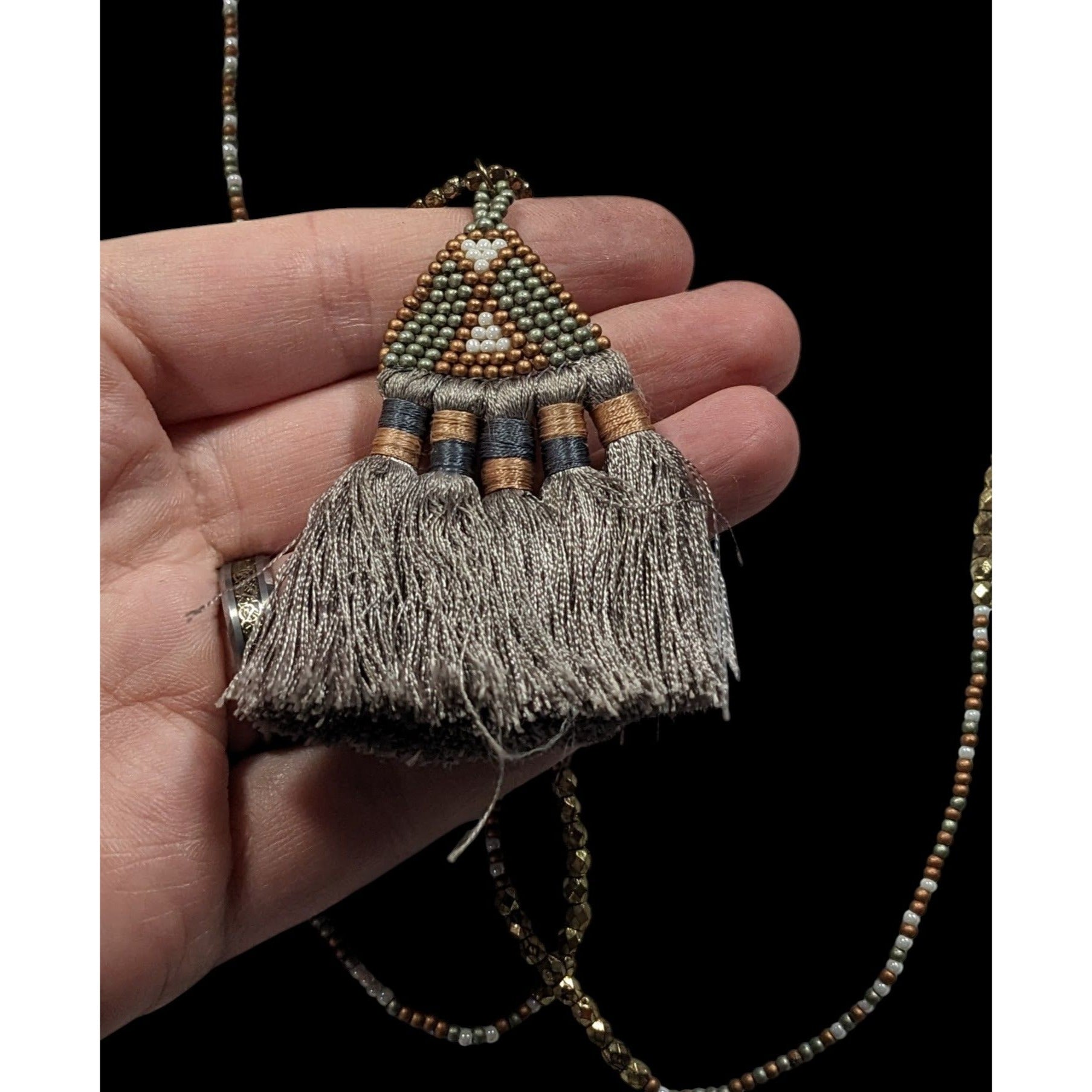 Elevate your style with this handmade boho necklace featuring grey and gold tone glass beads and a charming thread tassel. Perfect for adding a touch of elegance to any outfit.