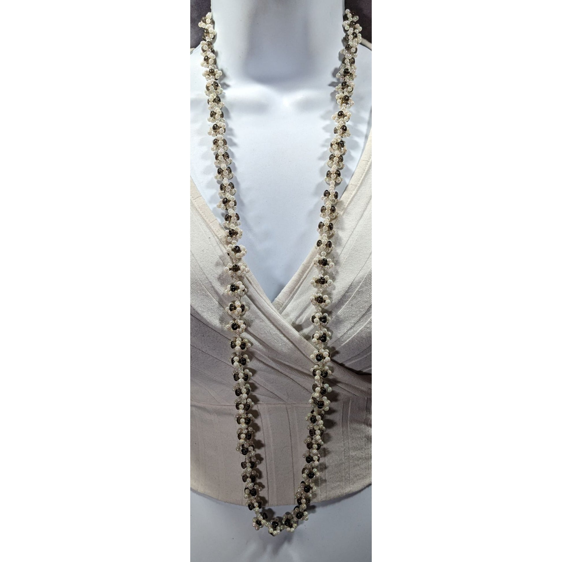 This elegant handmade necklace features black and white beads in a floral design, perfect for adding a touch of sophistication to any outfit. Ideal for both casual and formal occasions.