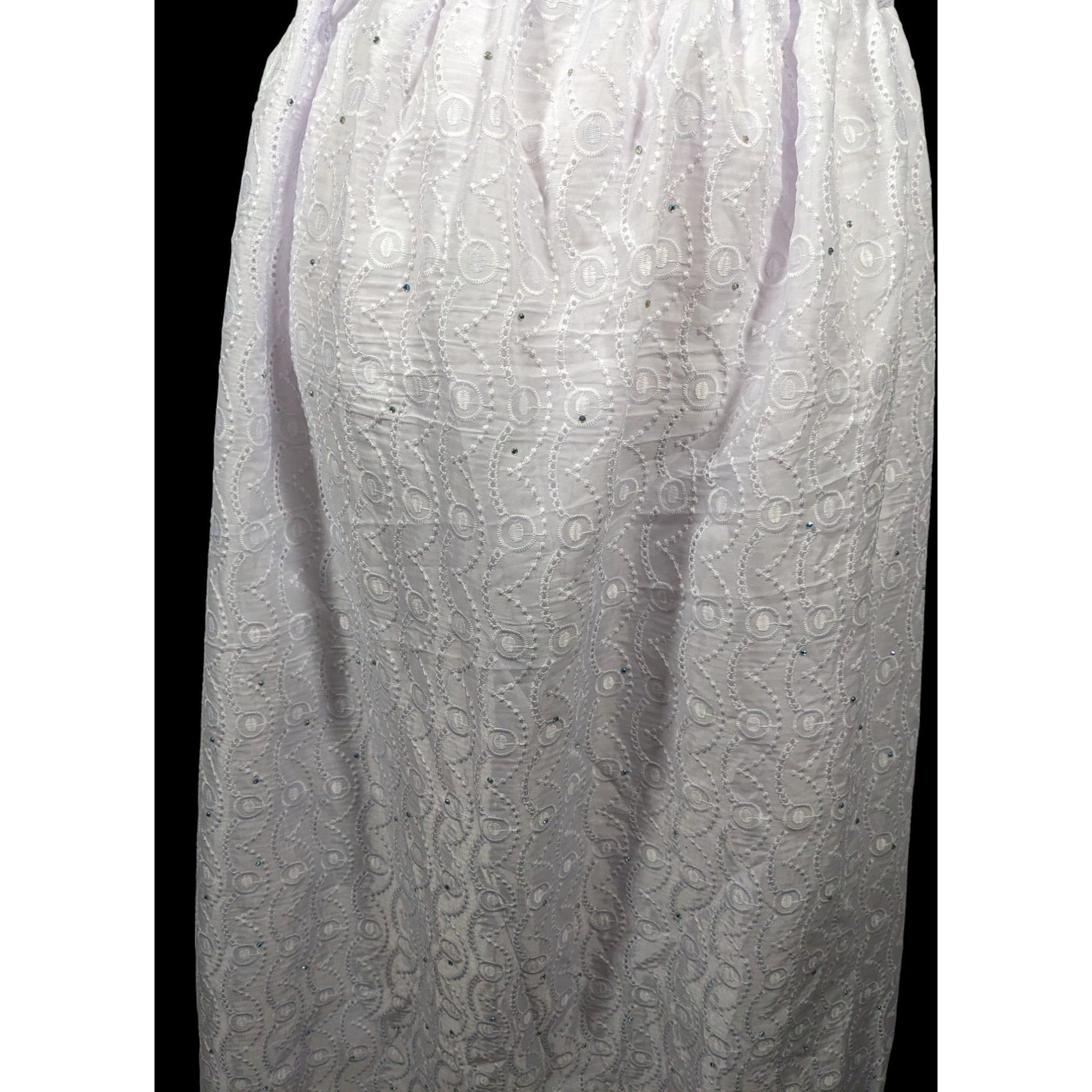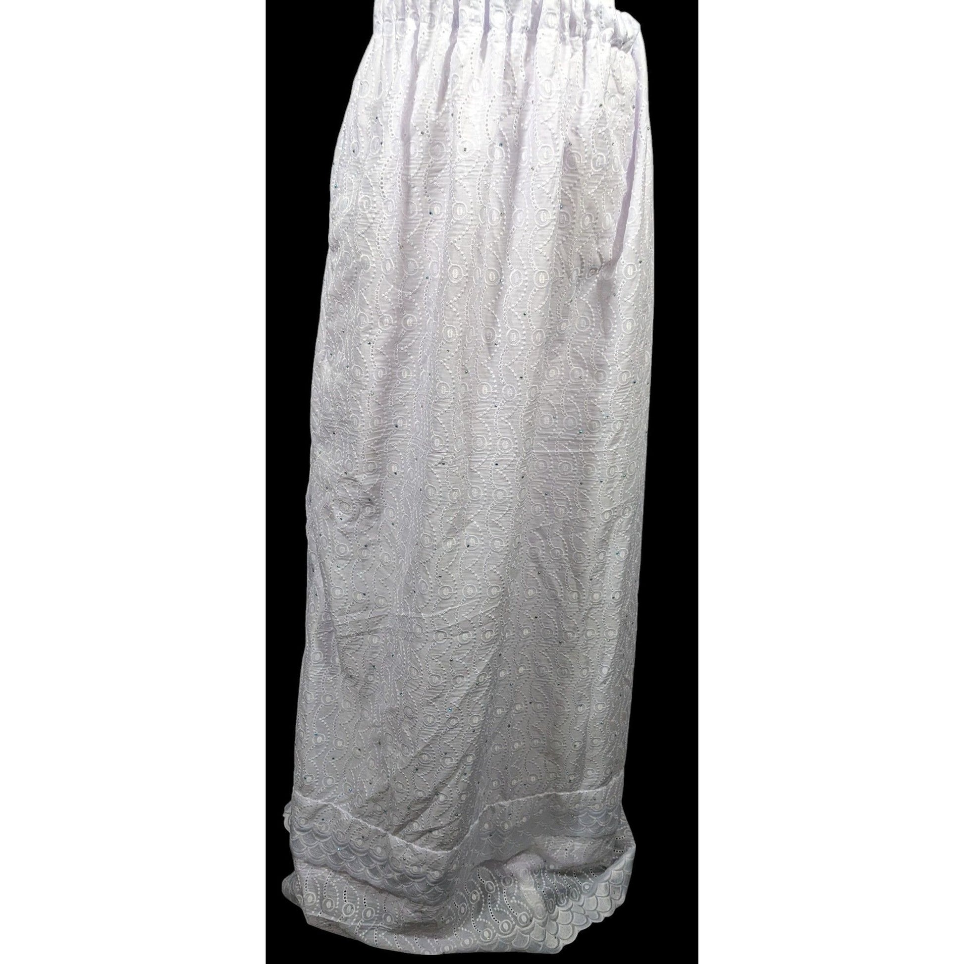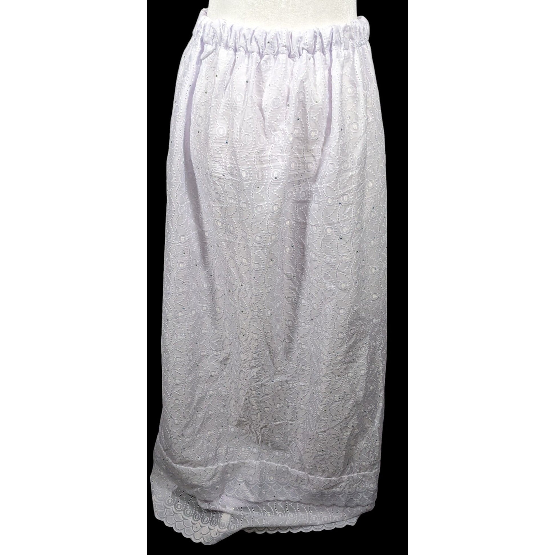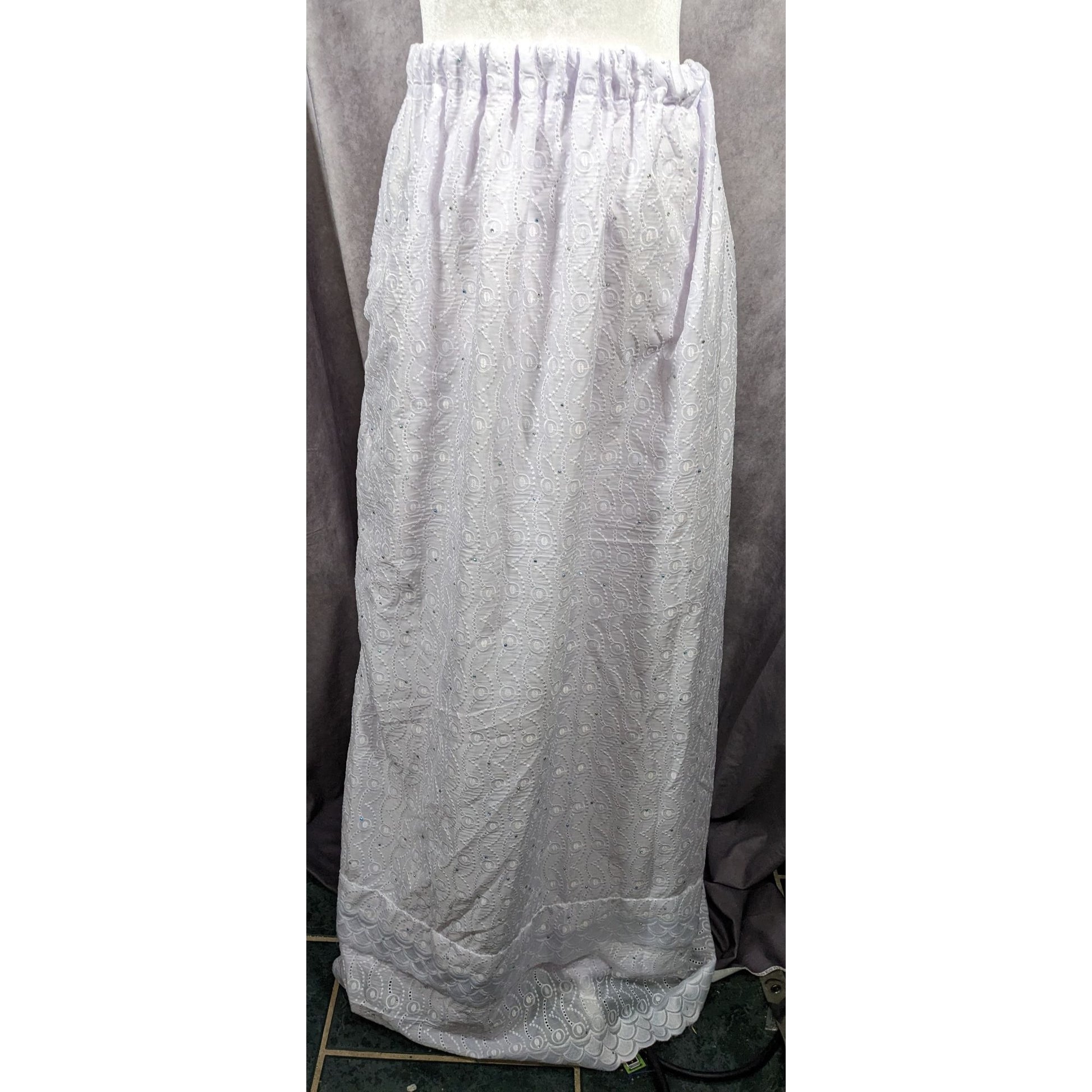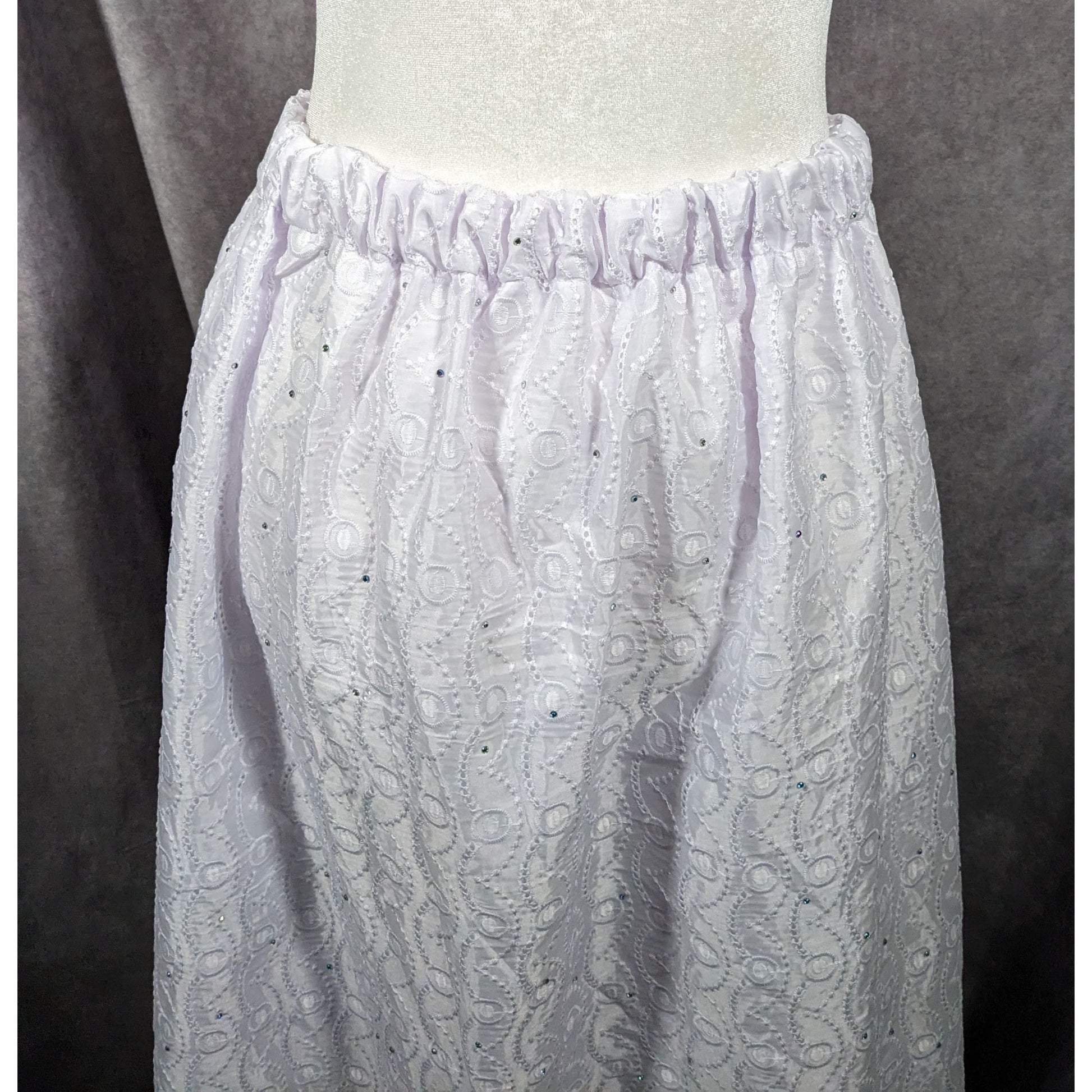 This stunning handmade maxi skirt features intricate floral embroidery and a subtle purple tint, perfect for any occasion. Its delicate design and comfortable fit make it a versatile wardrobe staple.