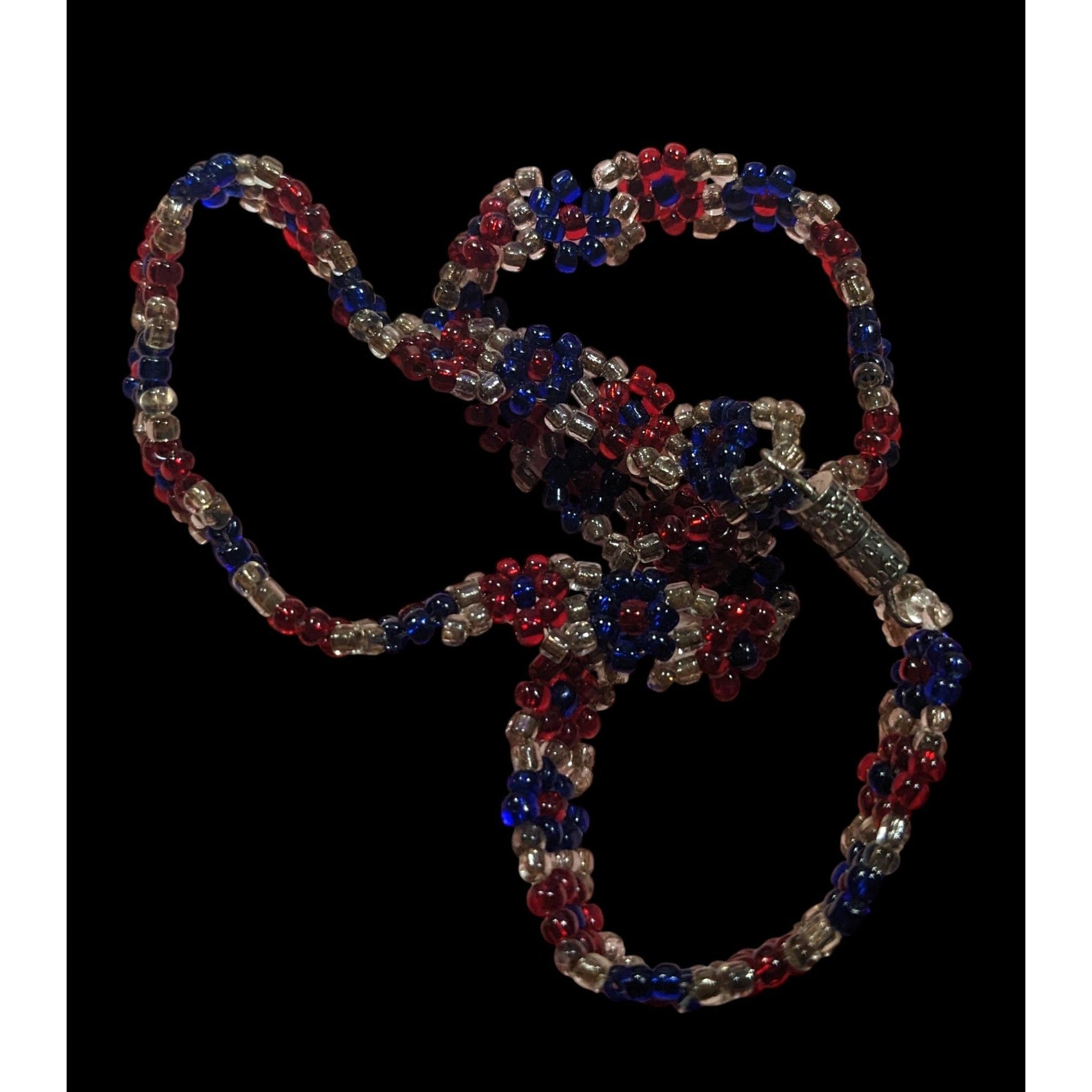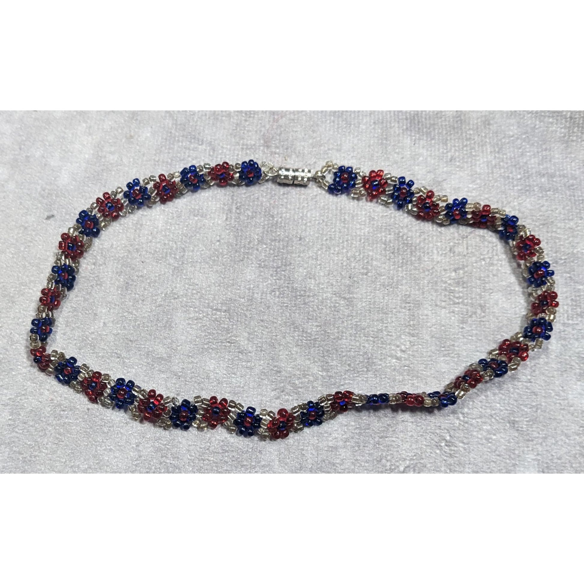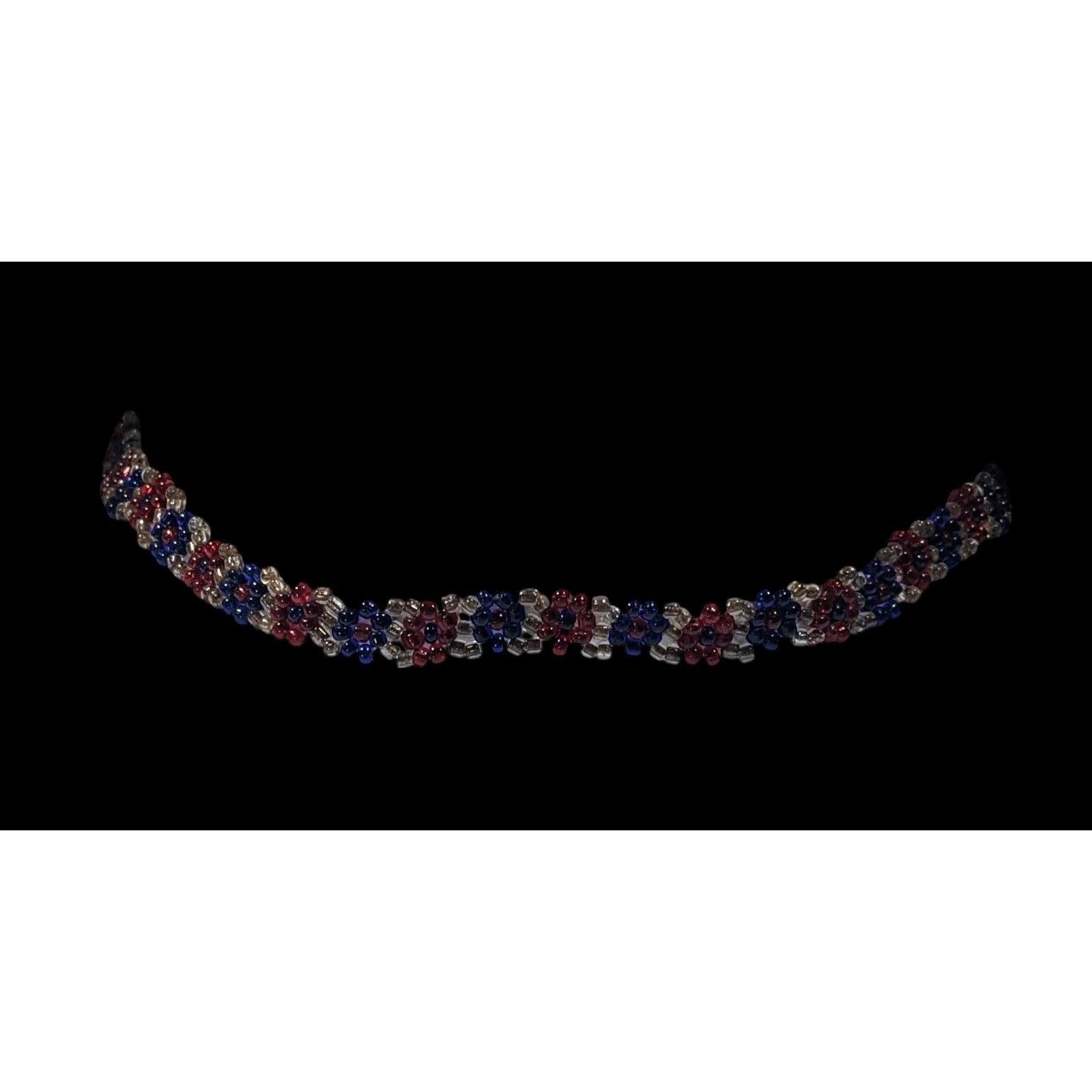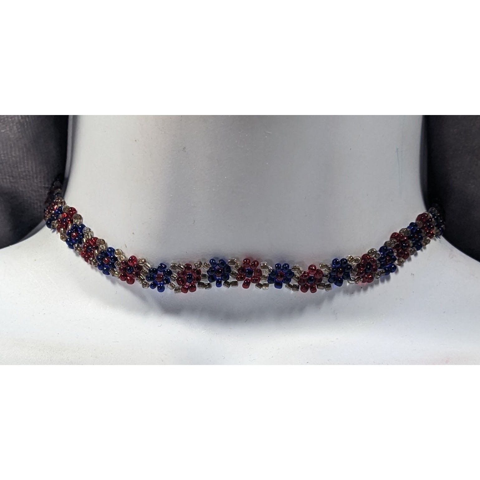 This stunning handmade choker features vibrant red and blue glass beads, perfect for adding a pop of color to any outfit. A unique accessory crafted with care for style-conscious individuals.