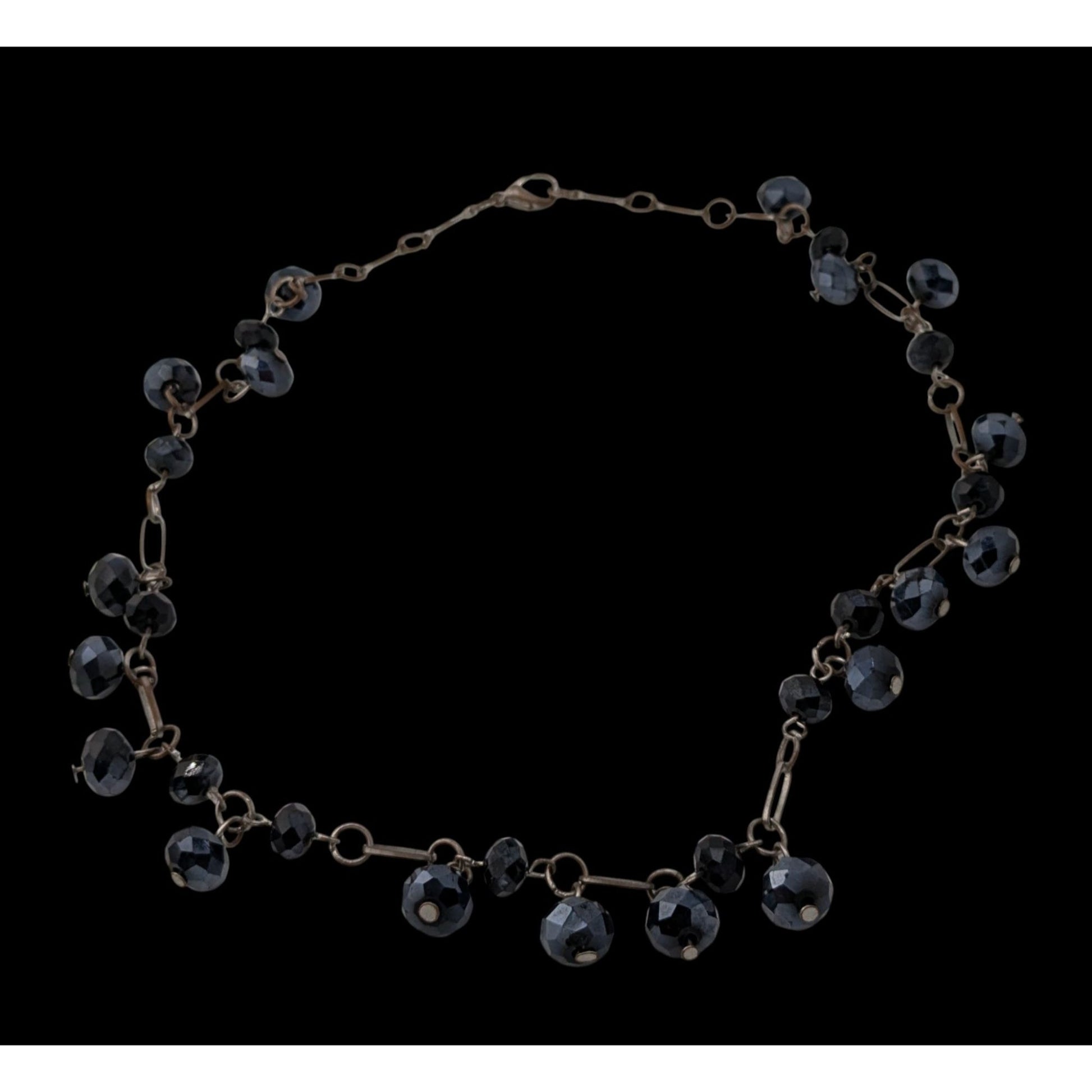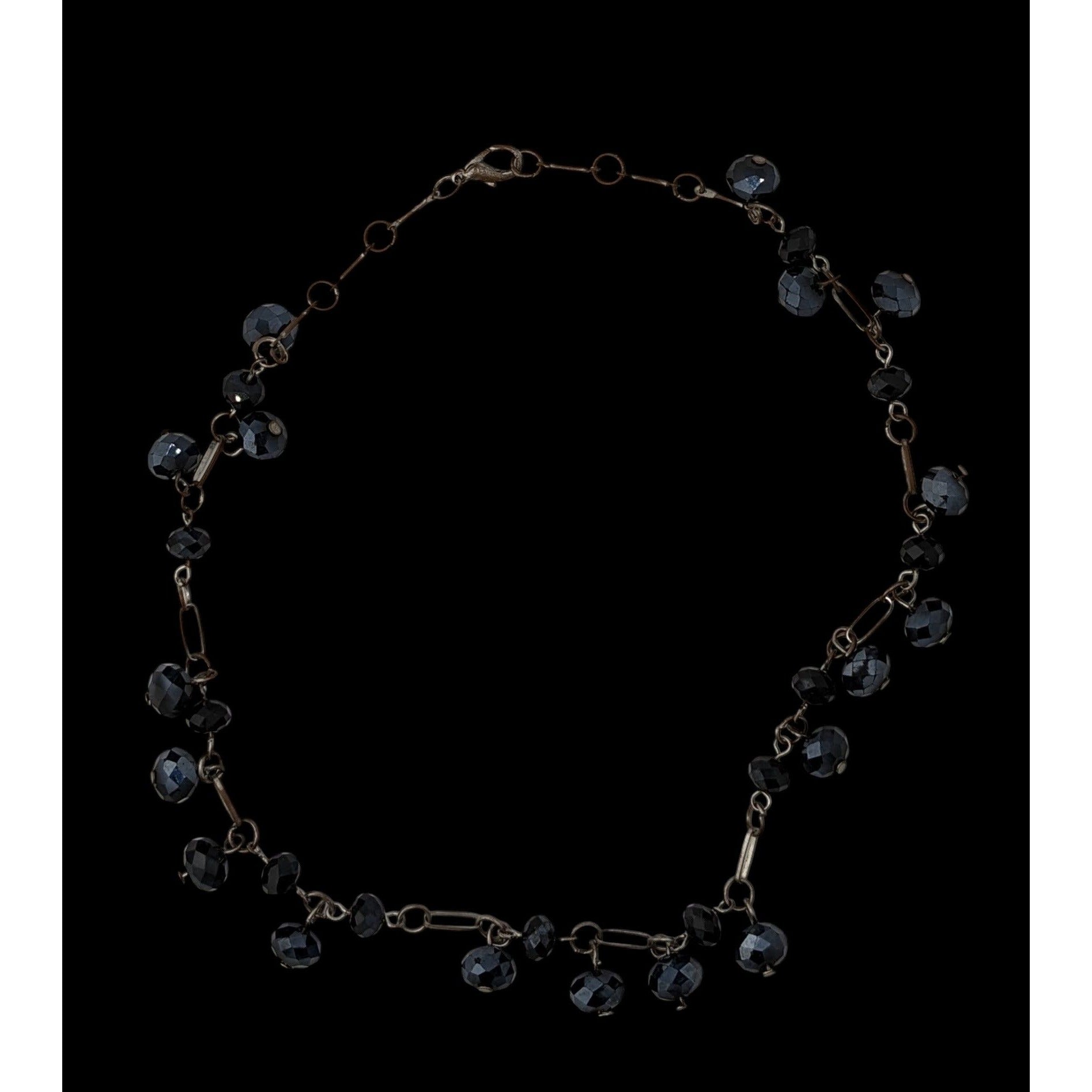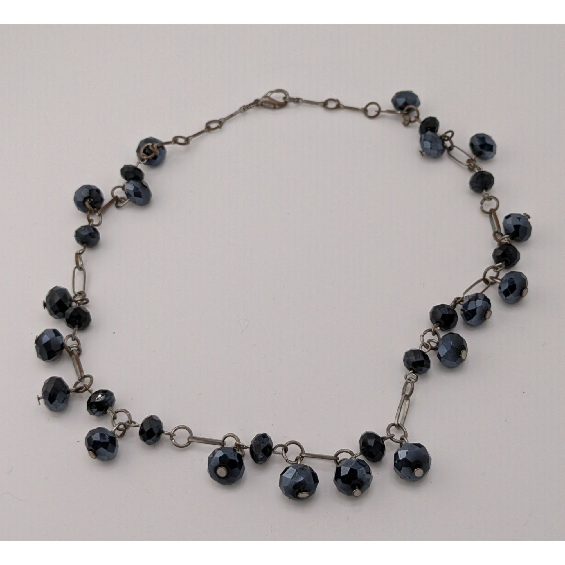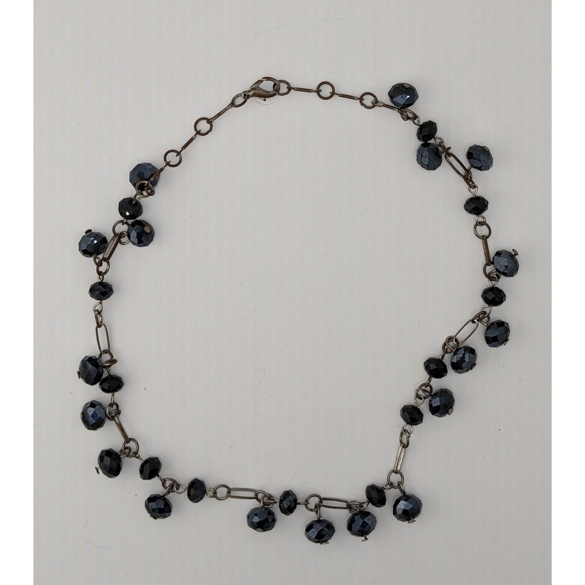 A timeless piece, this 16-inch black beaded necklace is crafted with faceted glass beads and a delicate gunmetal chain. Its vintage charm and shimmering beads add sophistication to evening outfits, capturing elegance in every detail. Perfectly lightweight, it's a versatile accessory for a refined touch to formal occasions.