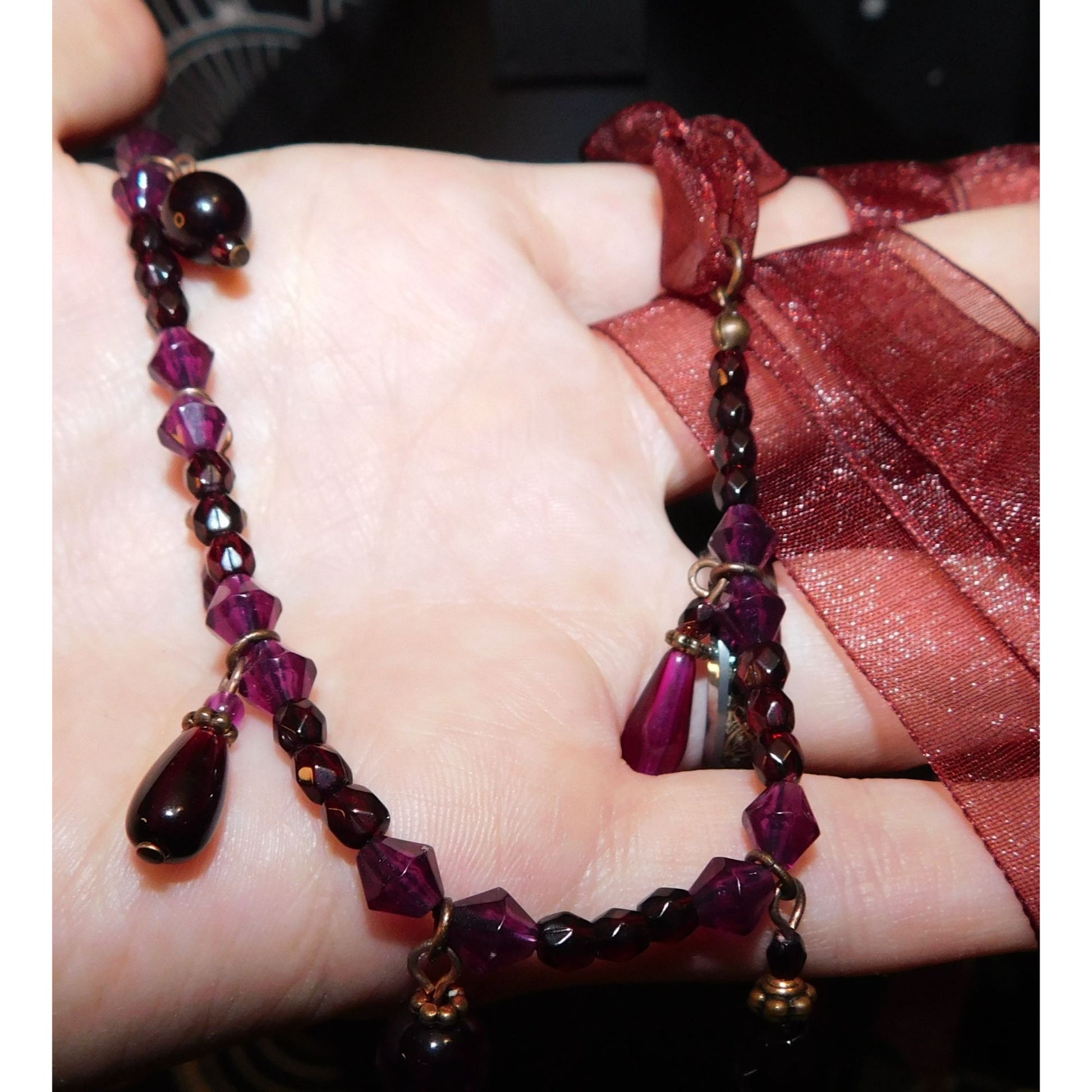 This handmade gothic necklace features striking red and purple beads in a unique tie-on design, perfect for adding a touch of elegance and mystique to any outfit.