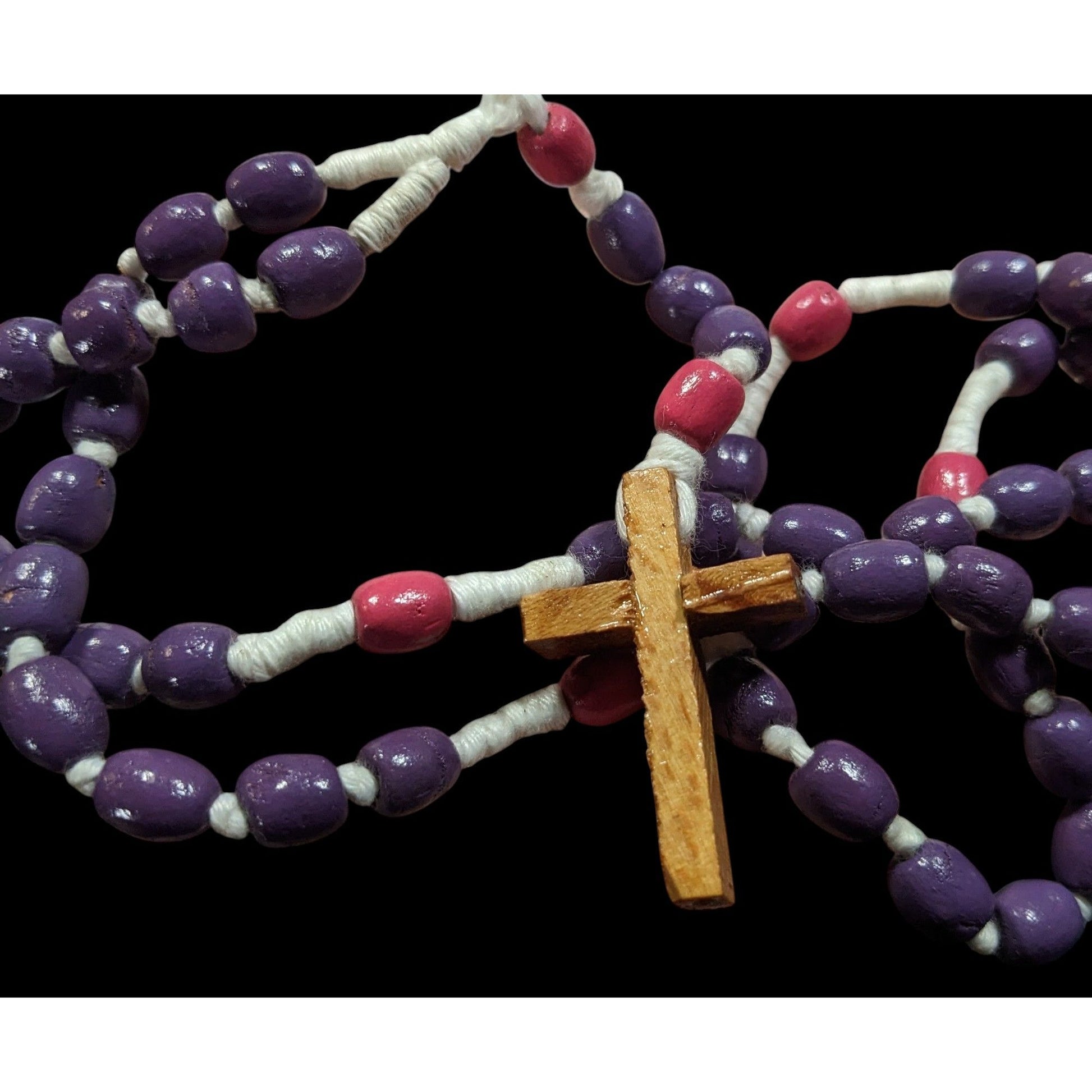 Beautifully crafted wooden cross necklace adorned with pink and purple beads. This handmade piece adds a touch of elegance and charm to any outfit. Perfect for casual or formal occasions.