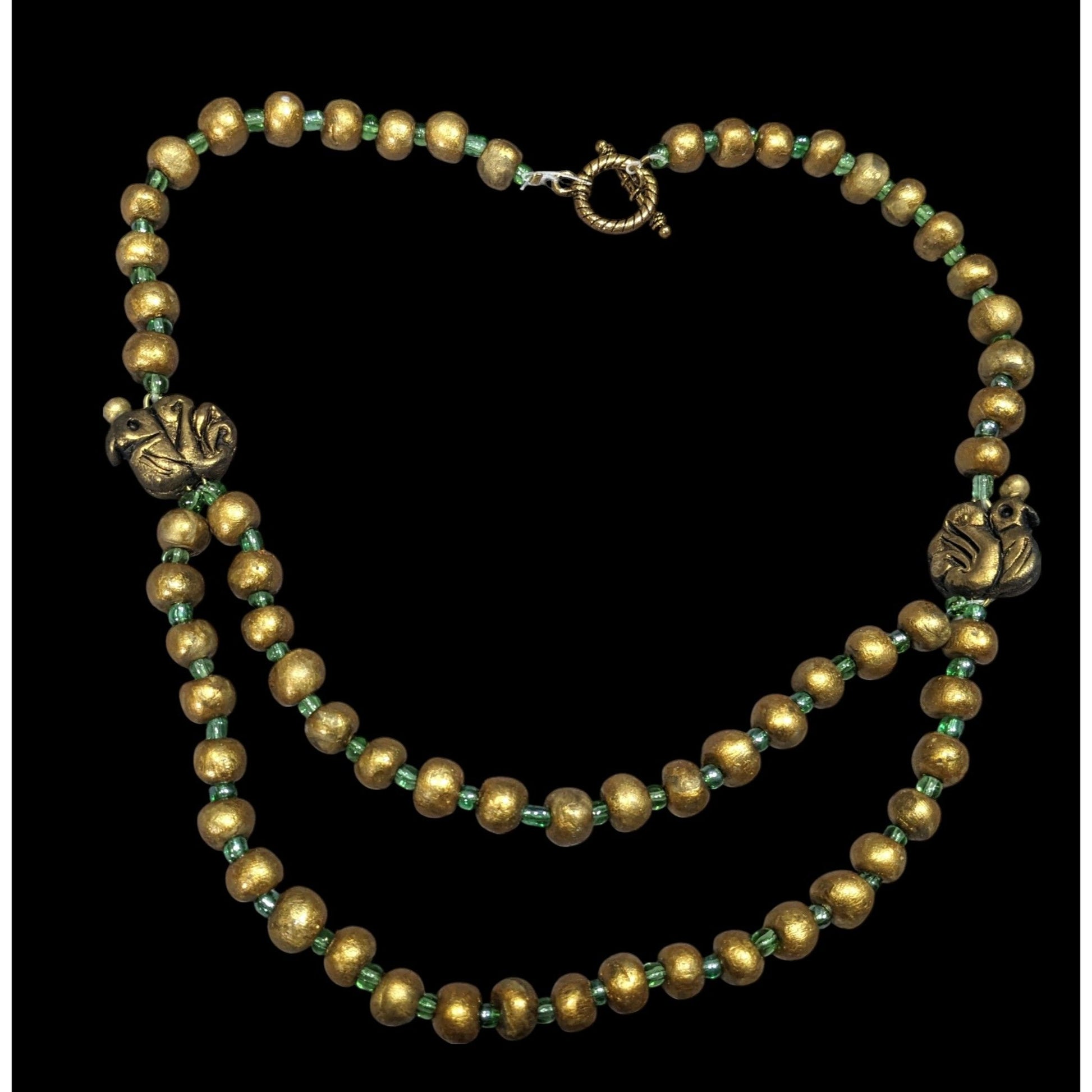 Handmade Polymer Clay Beaded Gold Tone And Green Necklace With Bird Accents