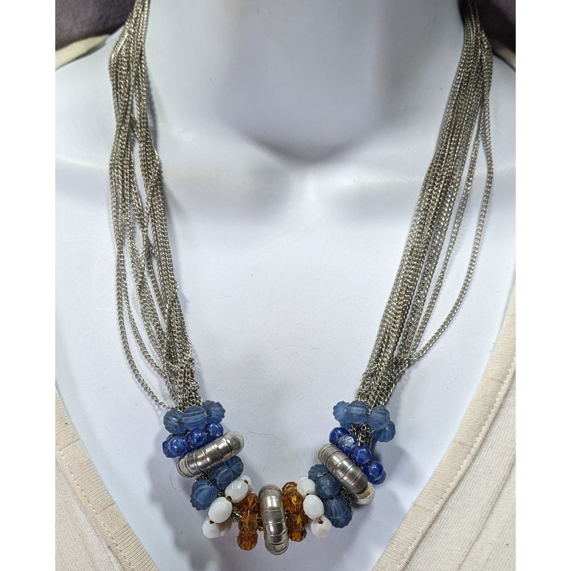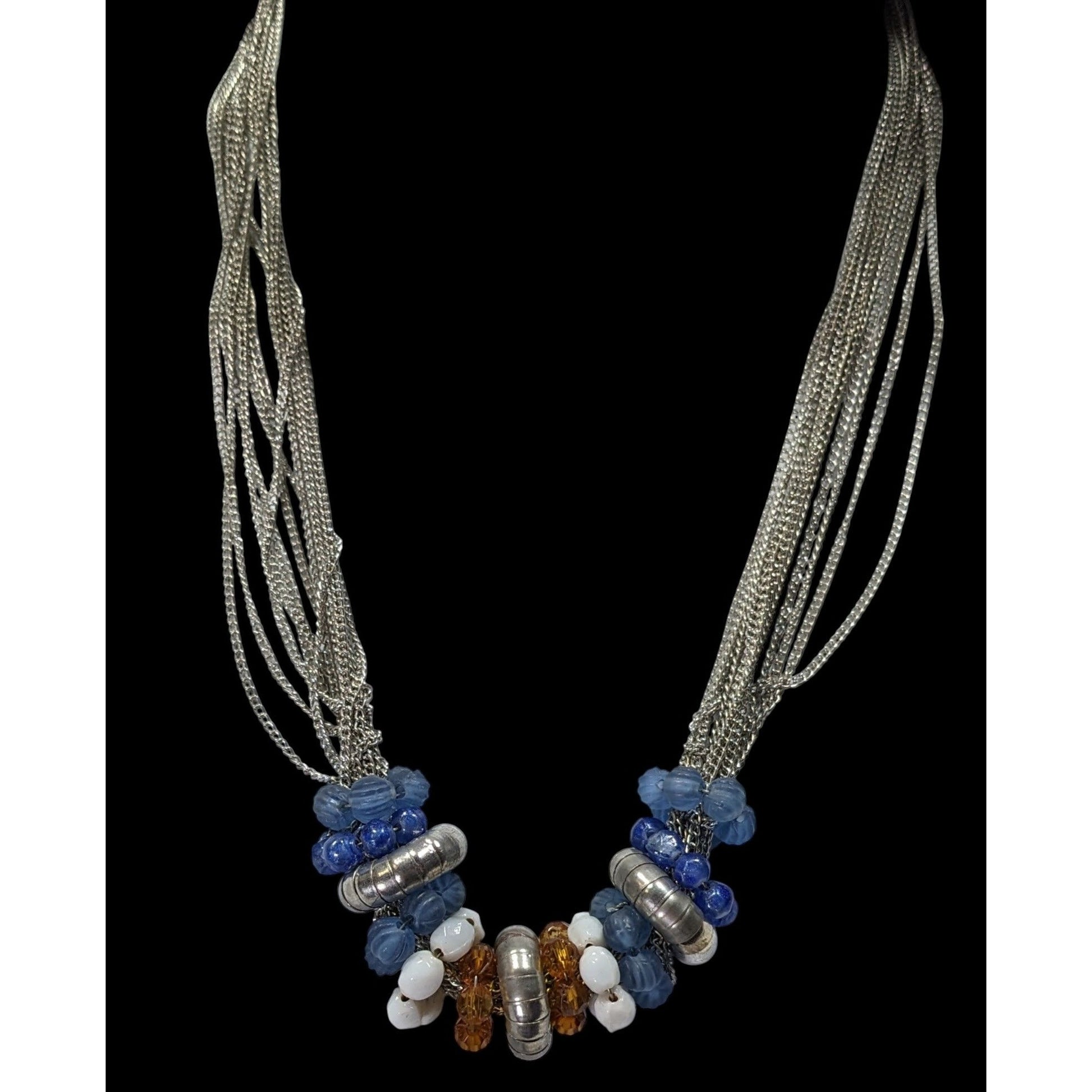 This elegant necklace tells a tale of shimmering silver strands embracing vibrant blue and honey beads, each element narrating a timeless story of beauty.