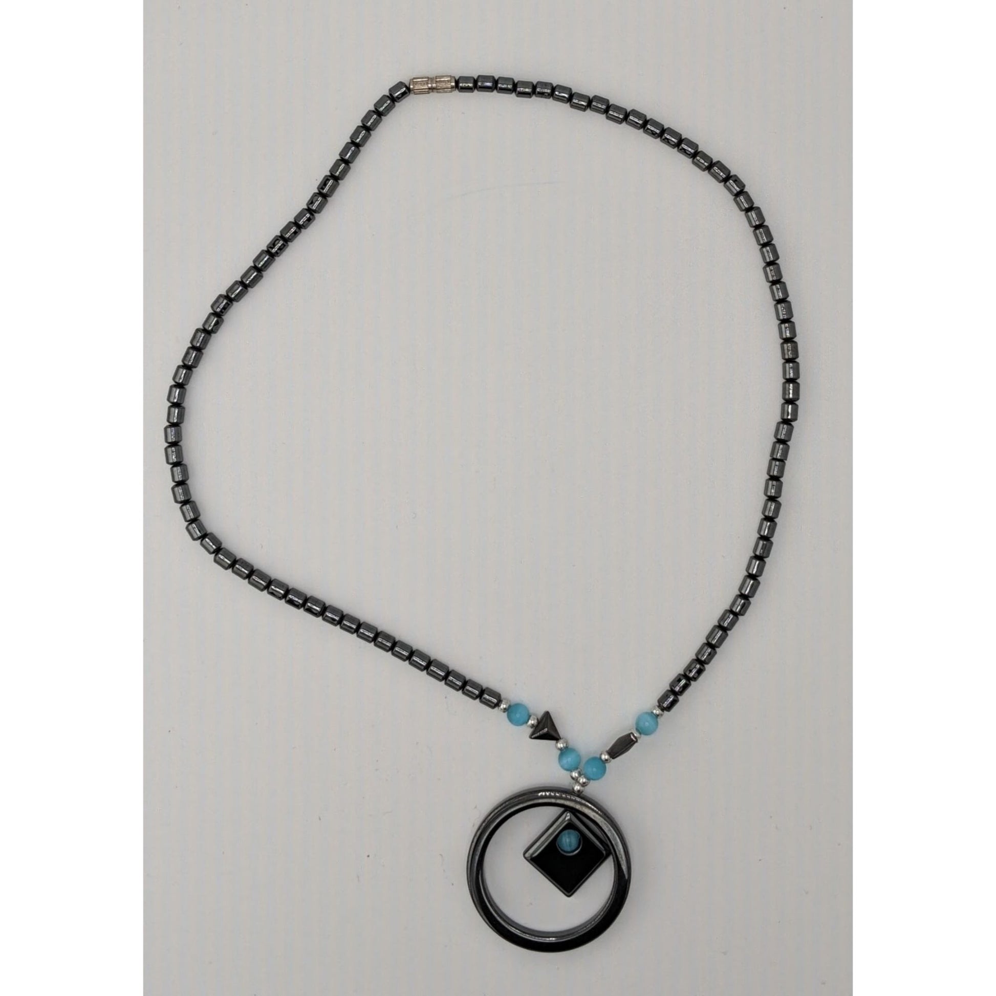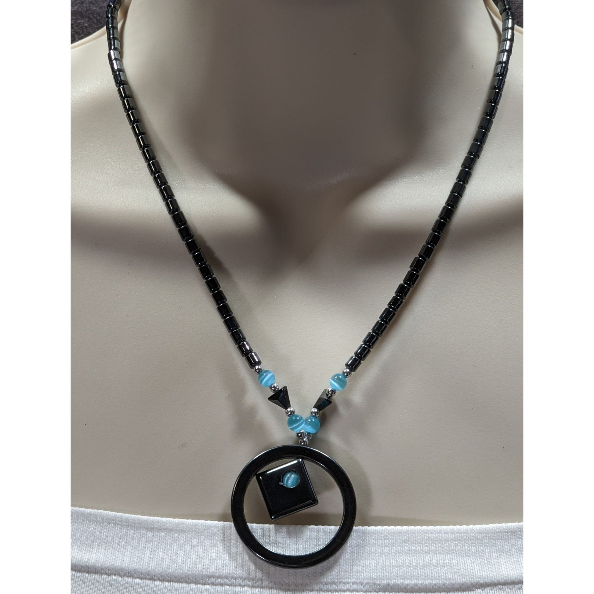 Hematite Geometric Beaded Pendant Necklace With Blue Cateye Glass Accents