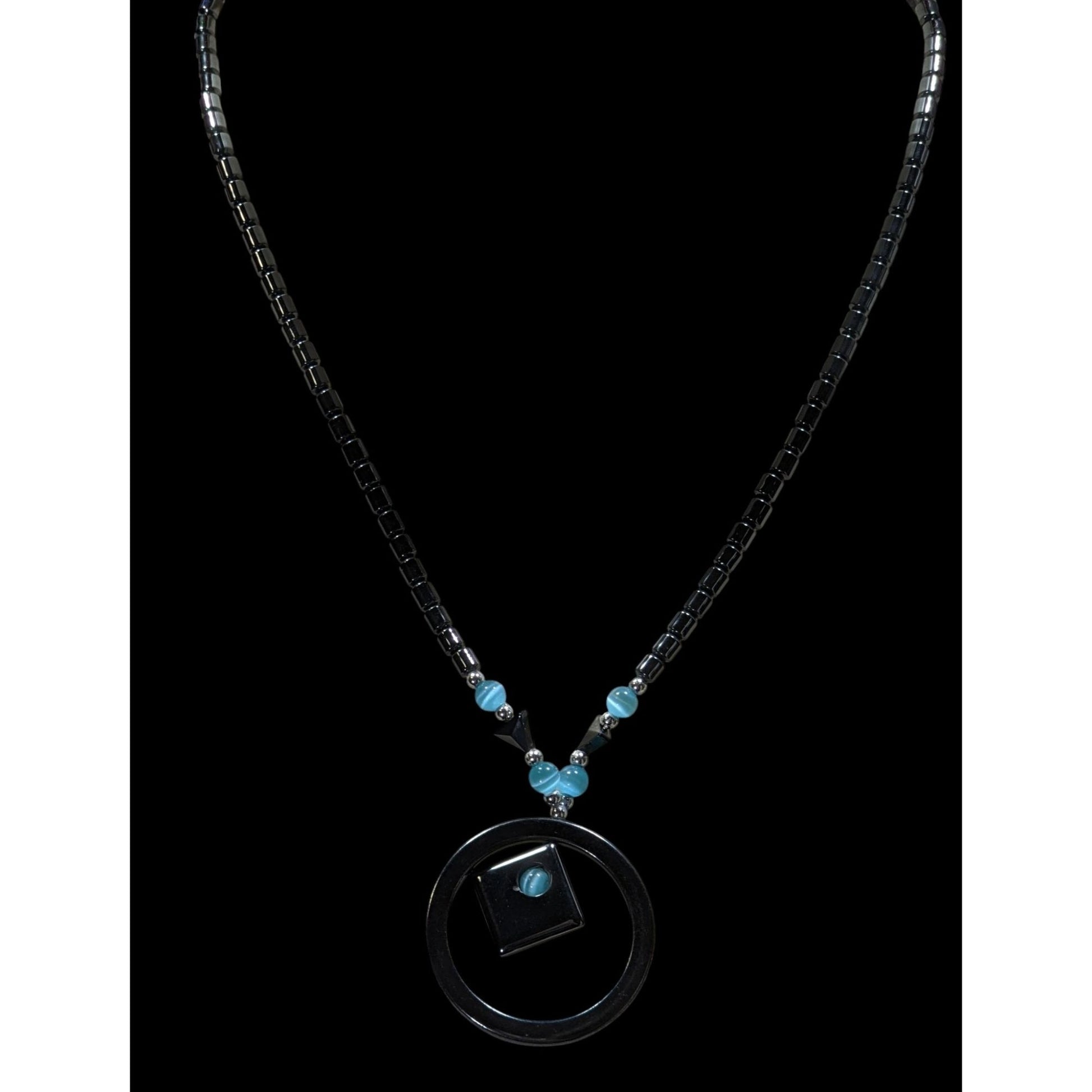 Elegant hematite pendant necklace featuring geometric beads and striking blue cateye glass accents, perfect for any occasion.