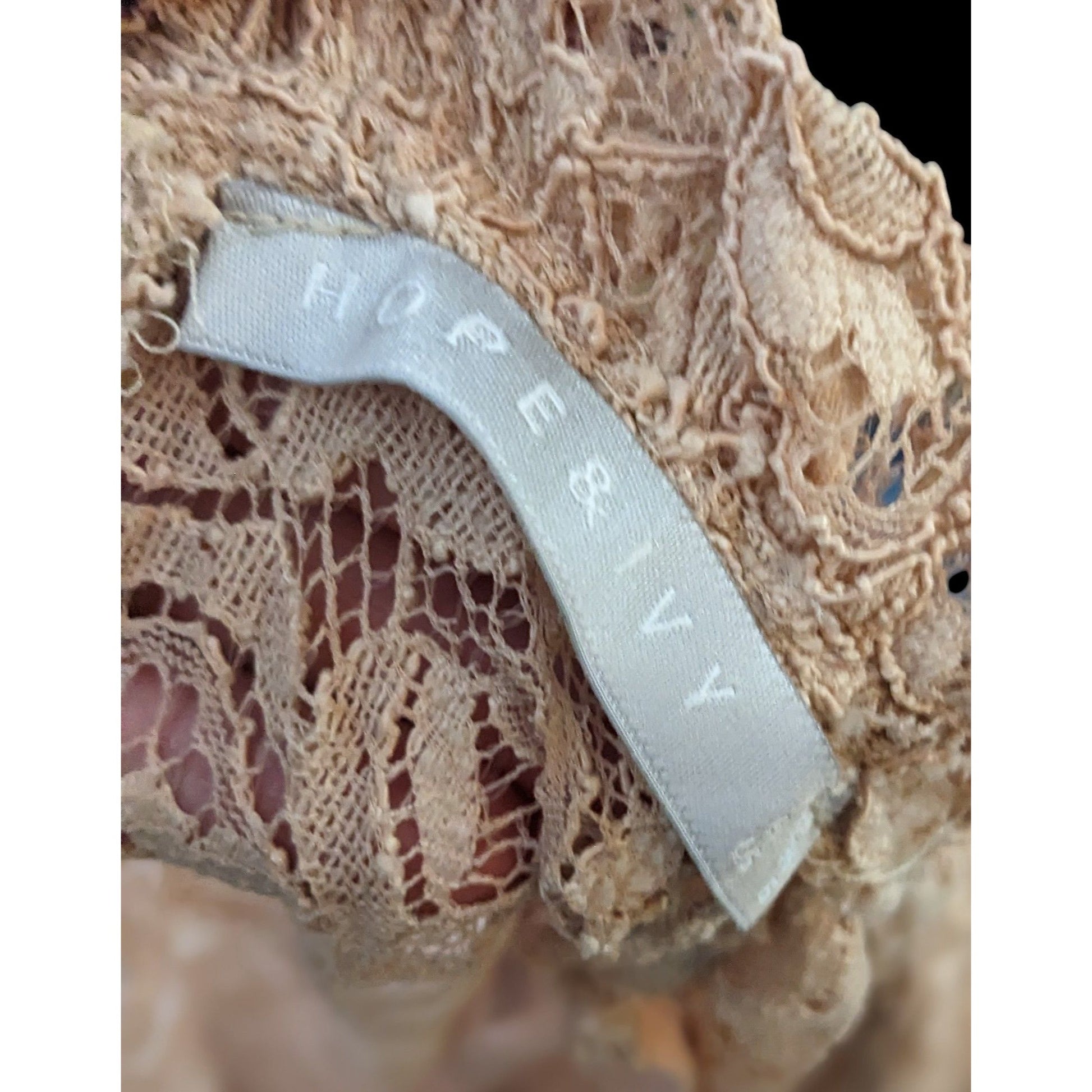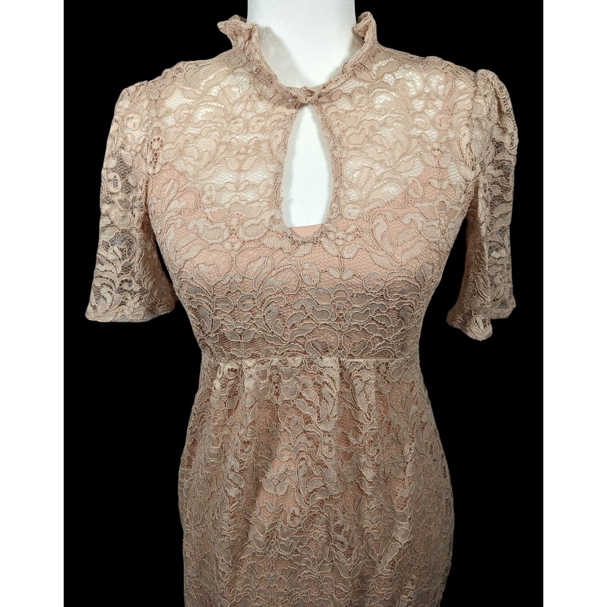 This elegant Hope And Ivy dress features a cream floral lace design with a keyhole neckline, offering a timeless and sophisticated look. Perfect for special occasions, its size 6 fit ensures grace and comfort.