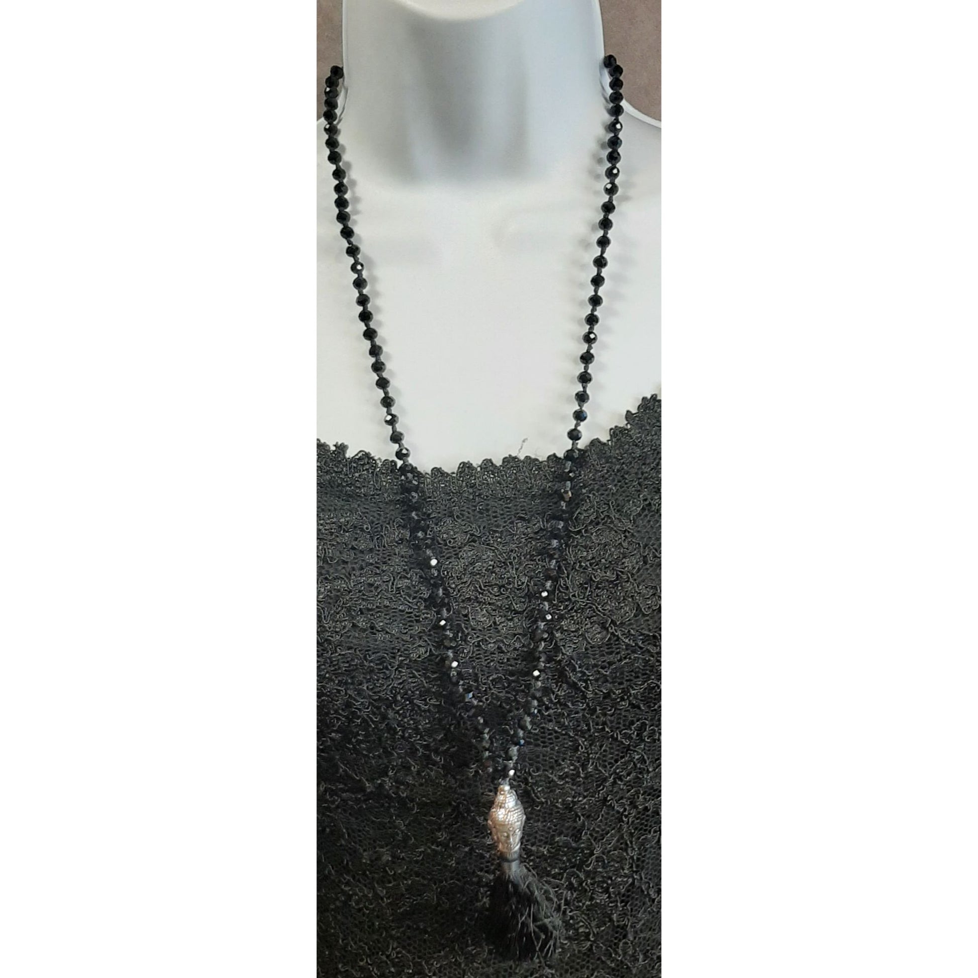 This striking necklace tells a story of tranquility and elegance. Featuring black beads, a silver-tone Buddha pendant, and a 3-inch tassel, it brings serenity and style to any outfit.