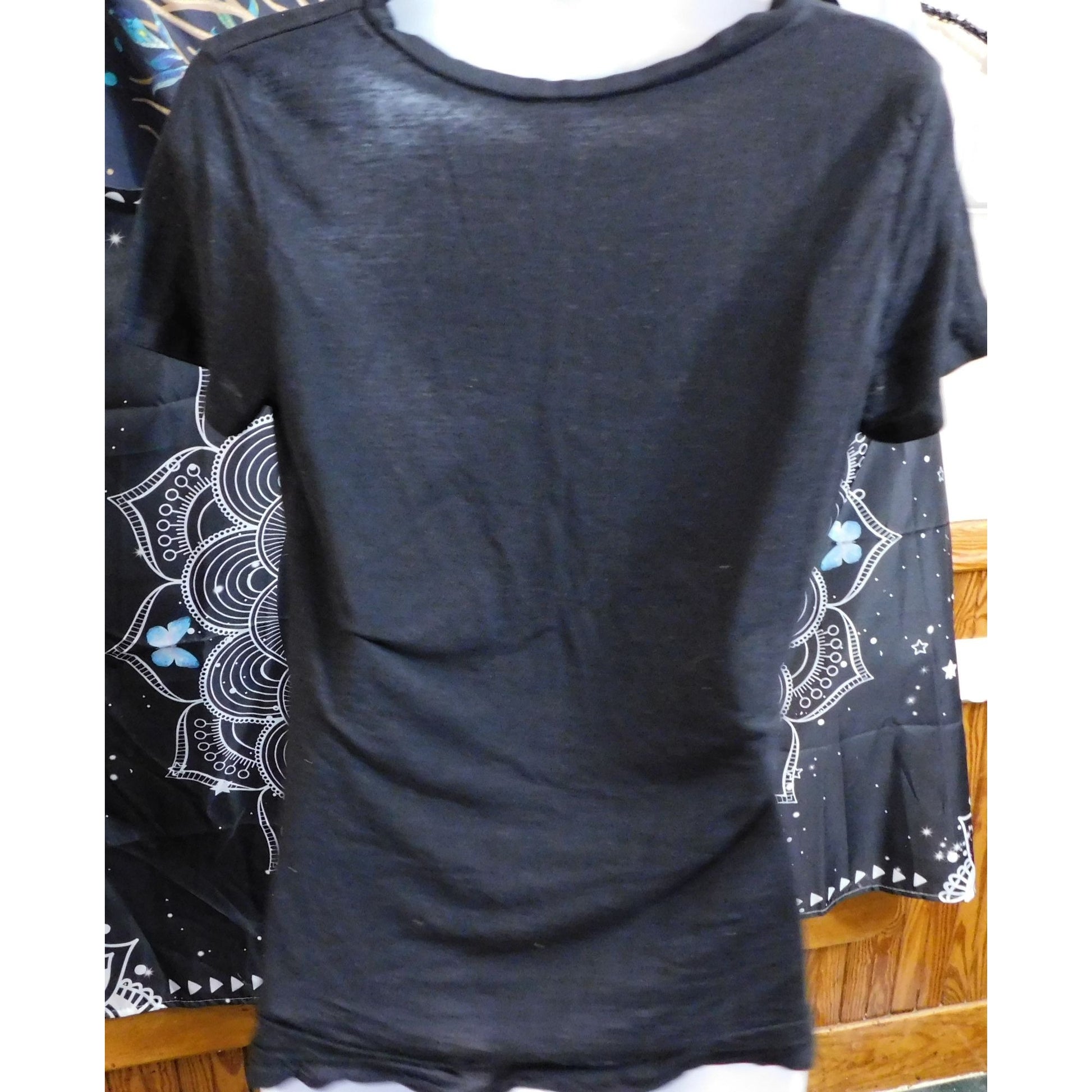 It's in a black, super stretchy fabric that's a tiny bit on the sheer side, but only slightly. It has white writing and design on the front. It has an eagle on a stars and stripes shield and it says "Johnny Cash The Man In Black Nashville, Tennessee The Original American Outlaw". Great for Johnny Cash fans, and vintage style shirt