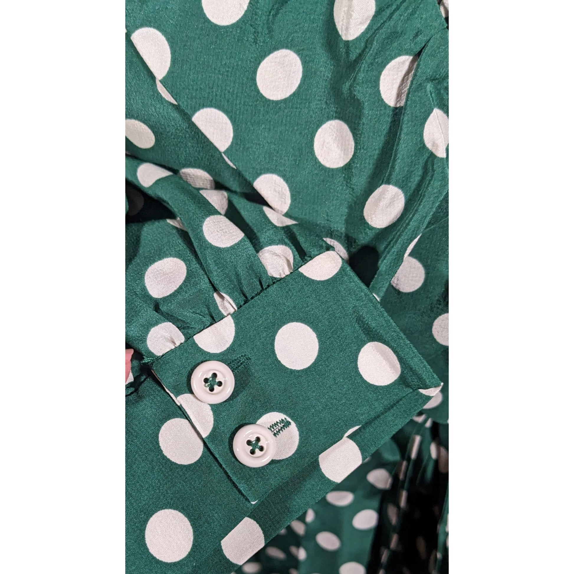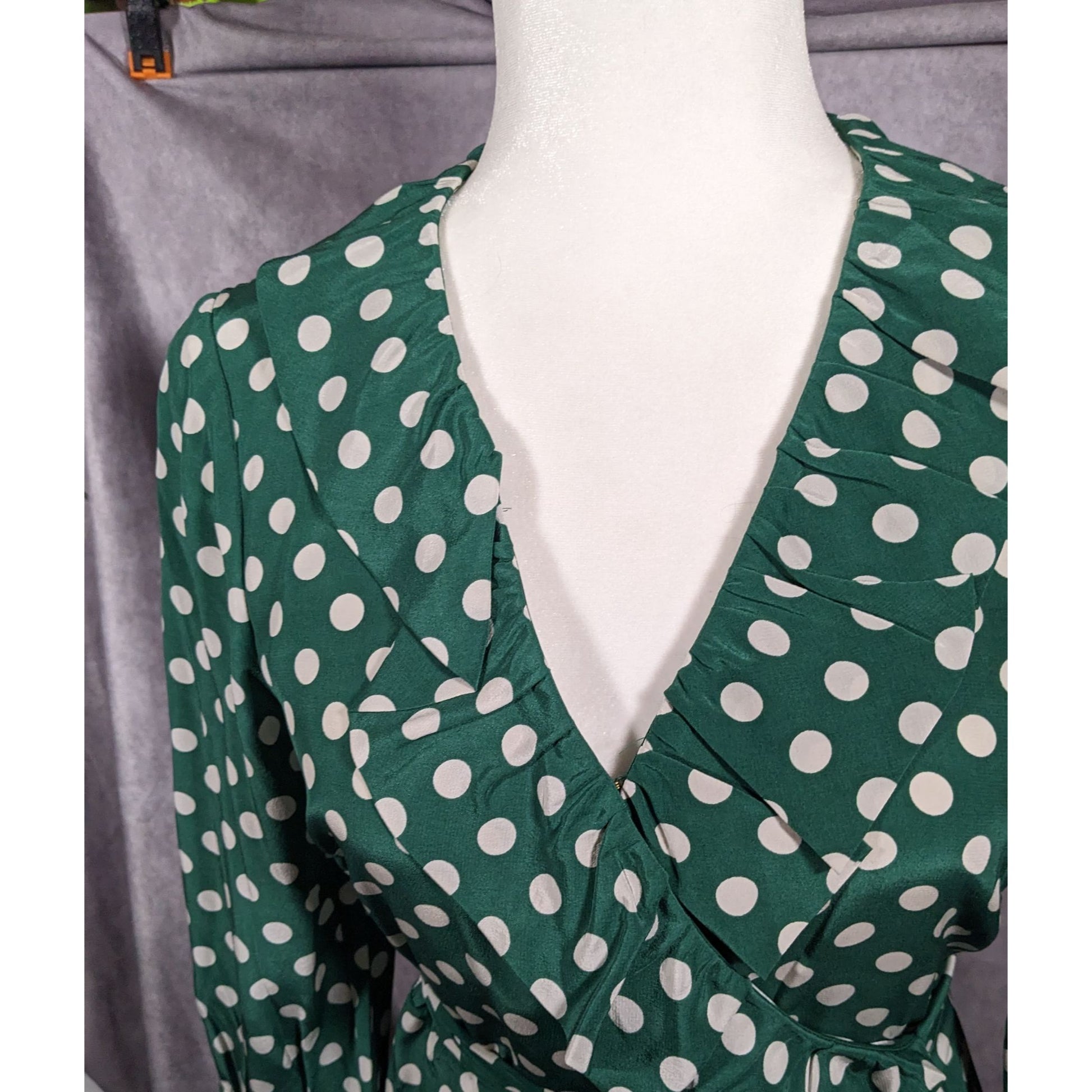 Elevate your style with this elegant Kate Spade wrap dress, featuring a timeless green and white polka dot pattern. Made from luxurious silk, it offers a flattering fit for any occasion.