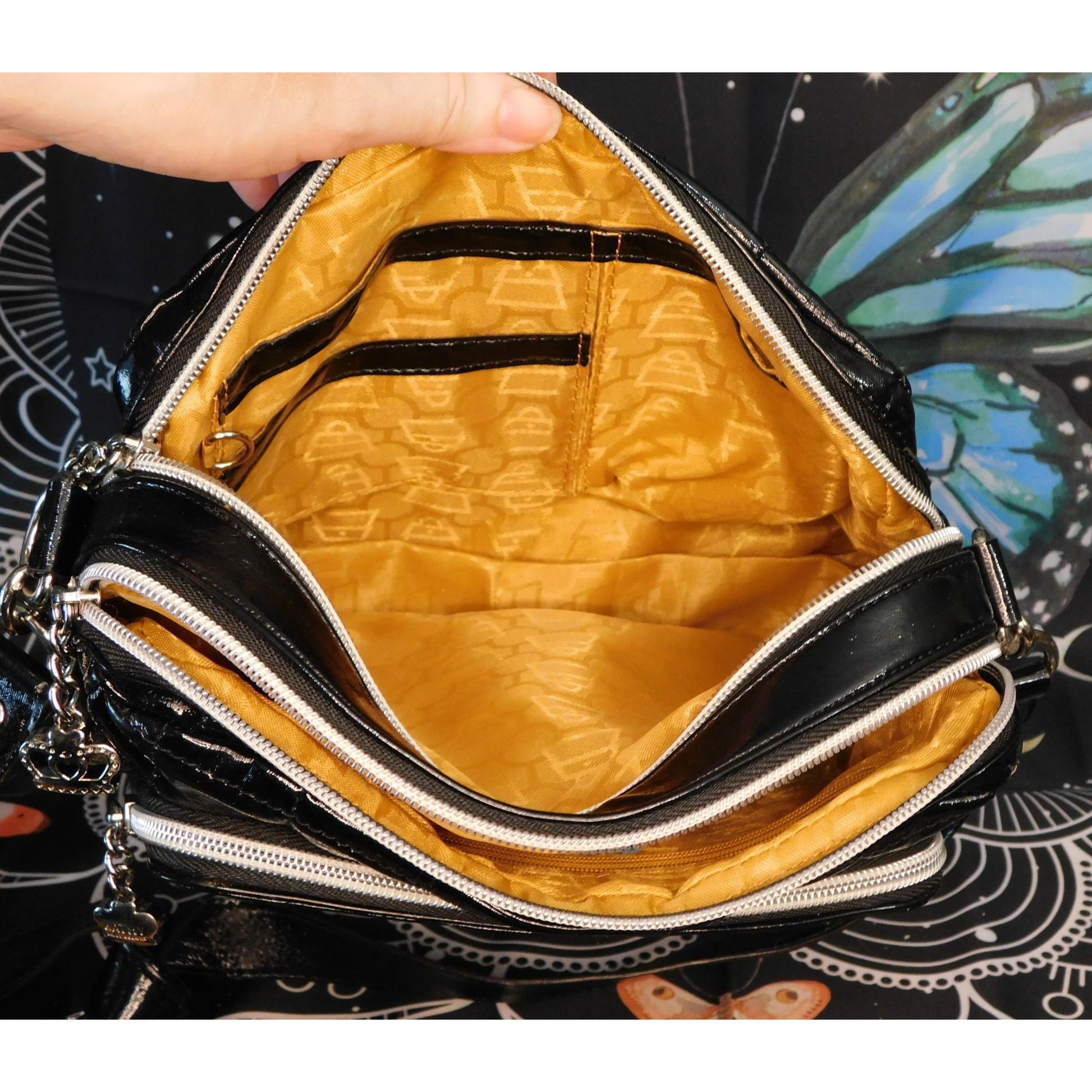 It's got a soft faux leather quilted exterior, and silver tone hardware. The shoulder strap is 1 inch wide and knotted at the top. It has a large 3x2.5 inch silver emblem on the front with a heart, crown, and ribbons, and it's encrusted with super sparkly rhinestones! All three zippers have chain and crown key pulls. It has three separate zipper compartments. They're all lined with a shiny goldenrod fabric. One pocket has a cell phone pocket and two card pockets, one has a zipper pocket, and the last has two slide pockets, two bill pockets, a zip pocket, and 10 card pockets - two with clear fronts for things like IDs.