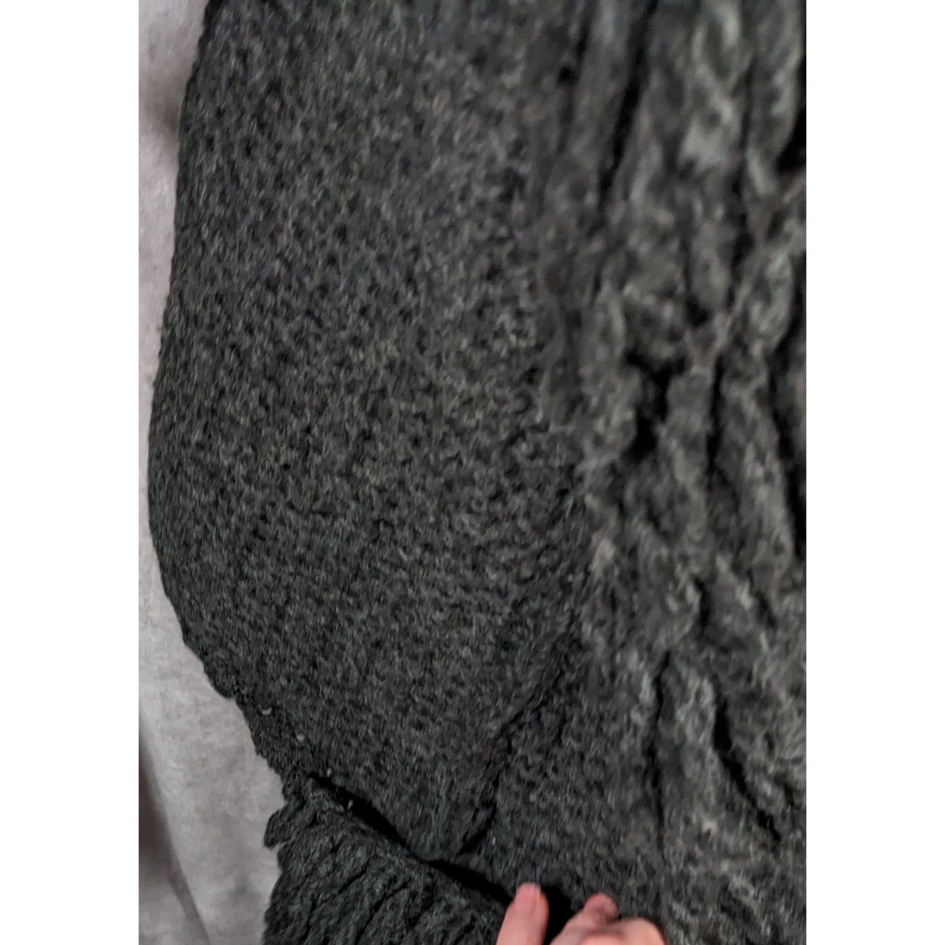 This vintage Kenar Italy cardigan features an open front design with a unique black fringe neck detail, perfect for adding a touch of elegance to any outfit. Ideal for medium-sized individuals seeking stylish comfort.